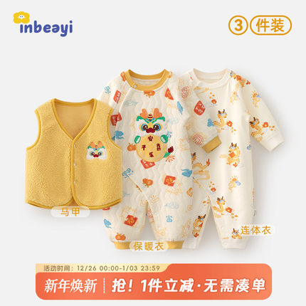 婴蓓依婴儿冬季保暖纯棉连体衣加绒马甲百天宝宝过年喜庆哈衣套装