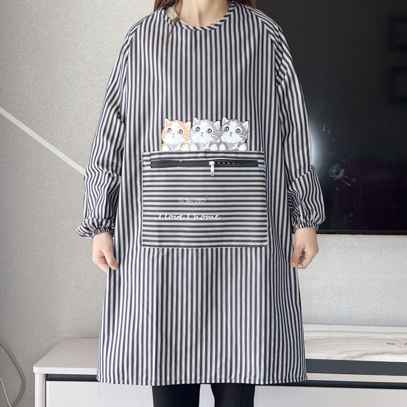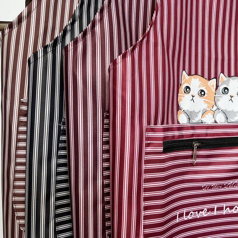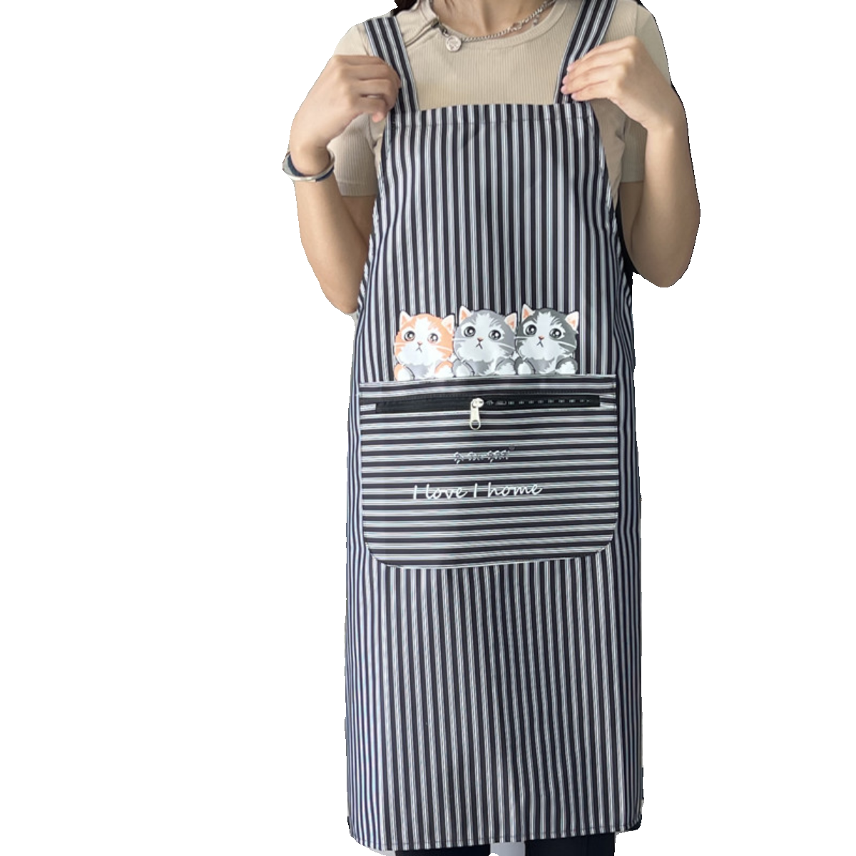 时尚双肩背带围裙猫咪可爱女网红防水围腰条纹美甲做饭简约工作服