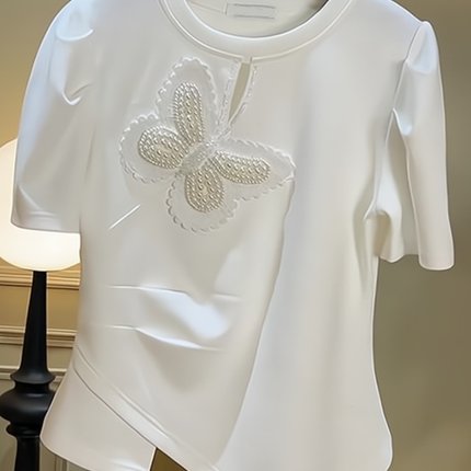 白色圆领蝴蝶镶钻不规则短袖t恤女夏季女装2024新款百搭气质上衣