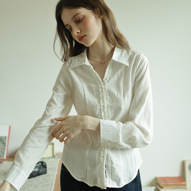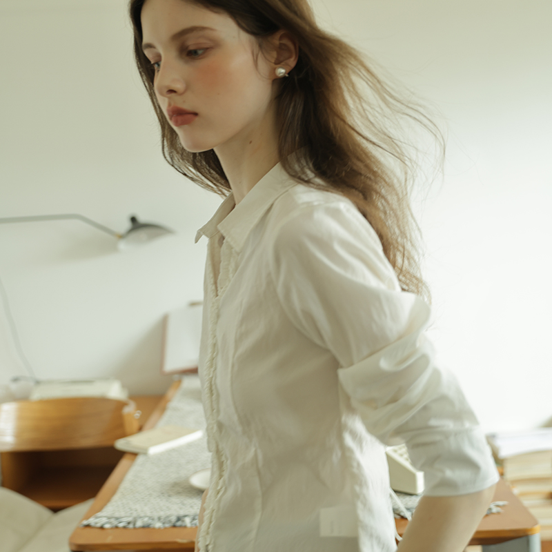 宫廷风白色花边背后系带长袖衬衫女秋新款小众设计感收腰显瘦衬衣