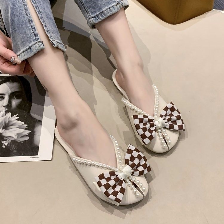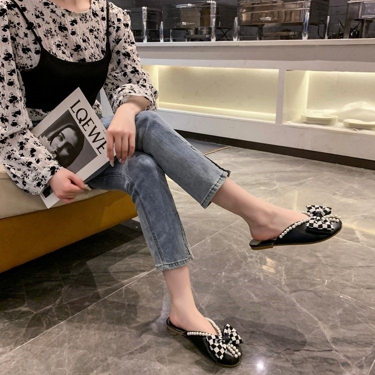 35-43码 大码女鞋42夏季透气包头半拖鞋女41仙女风珍珠蝴蝶结凉拖