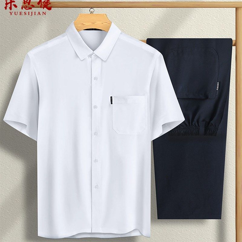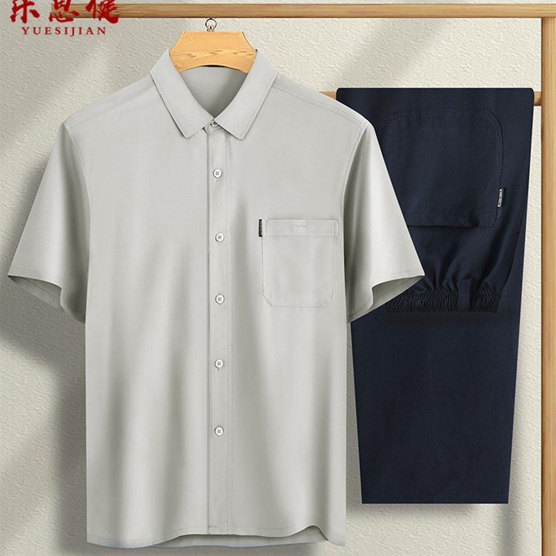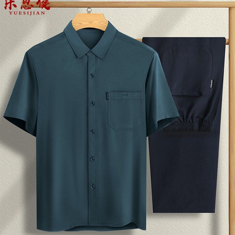 爸爸装夏冰丝短袖衬衫男中老年套装宽松衬M衣男休闲两件套老人衣