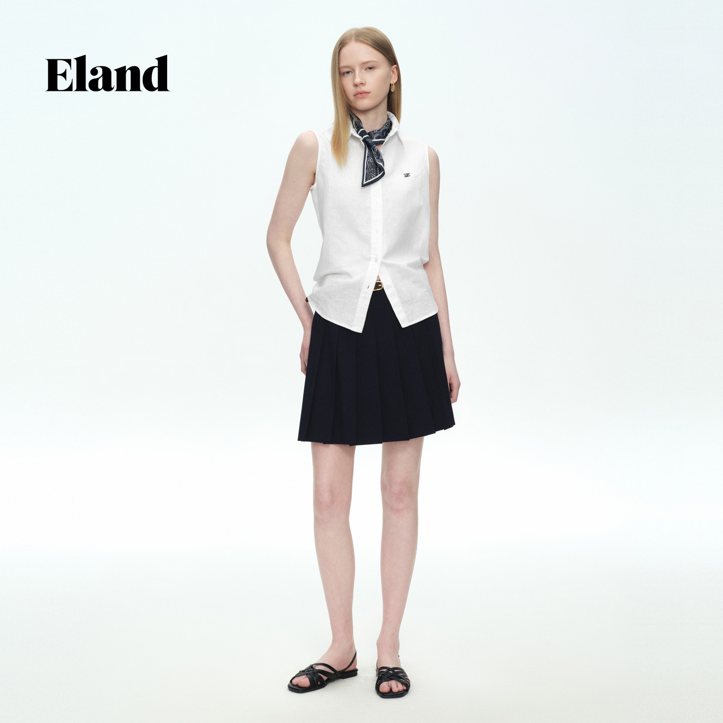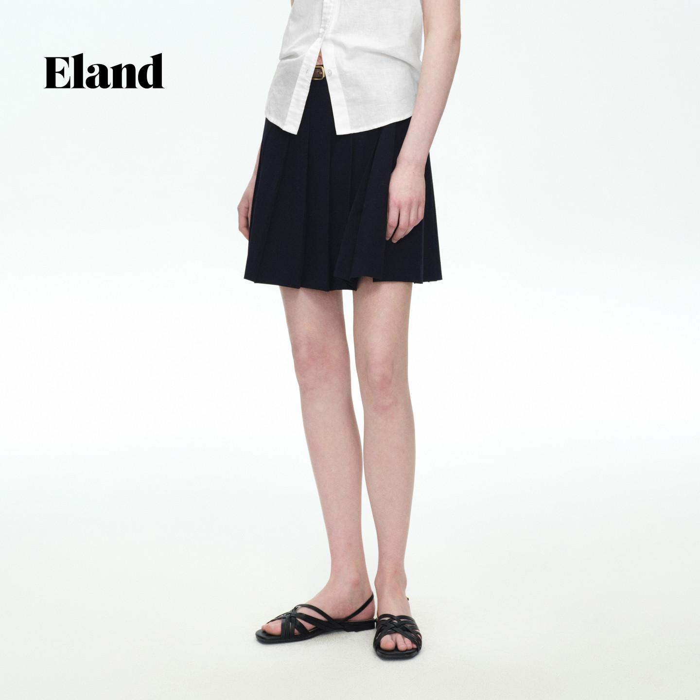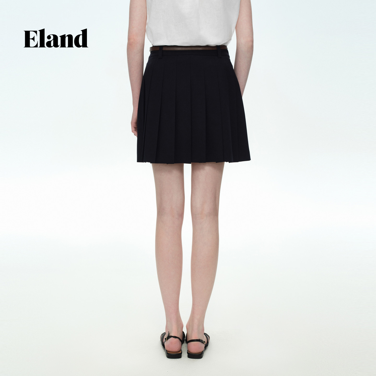 ELAND纯色收腰百褶短裙