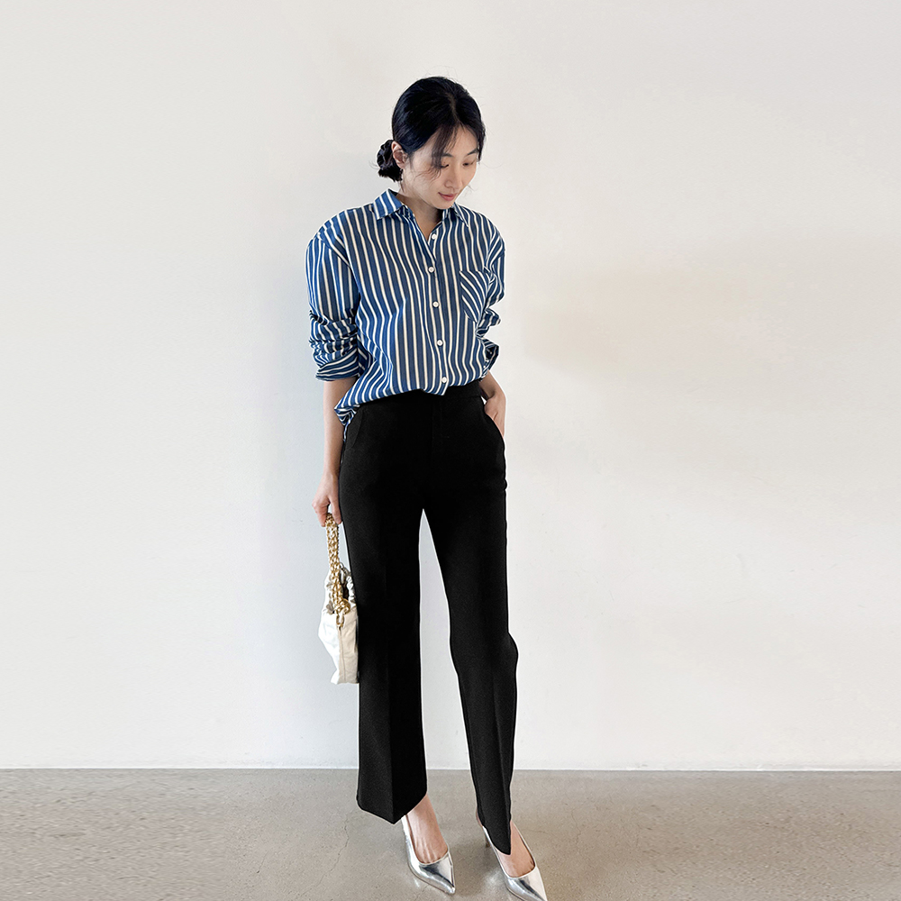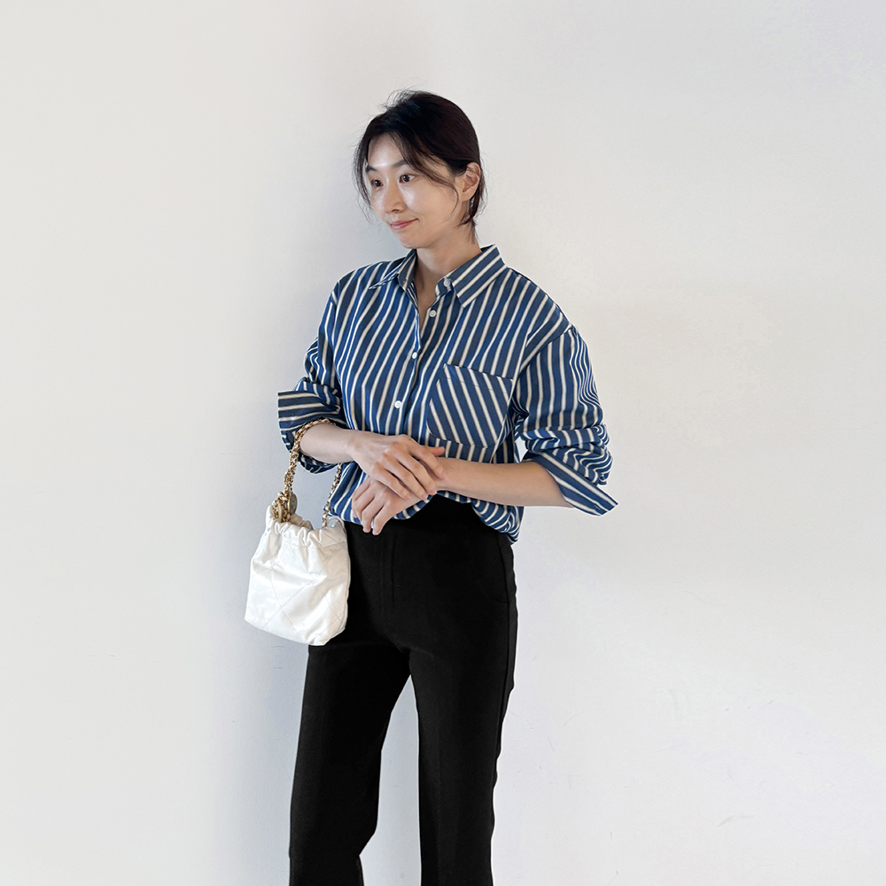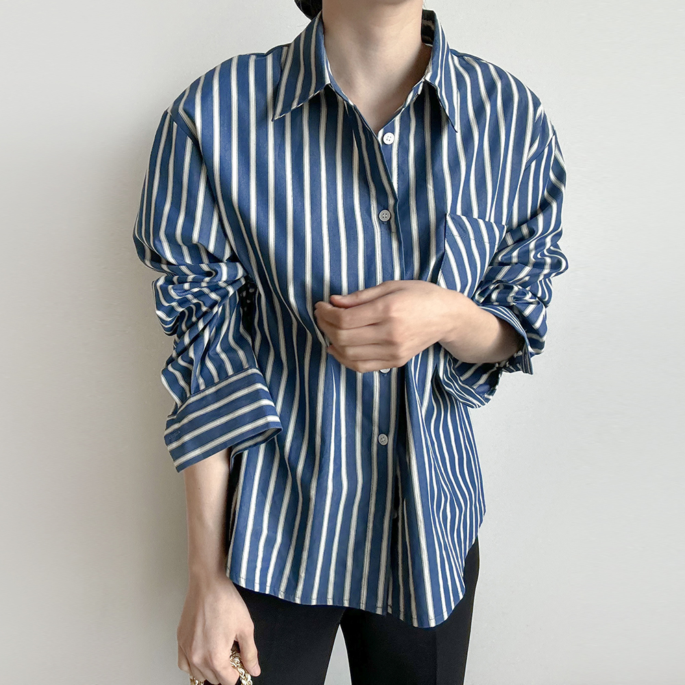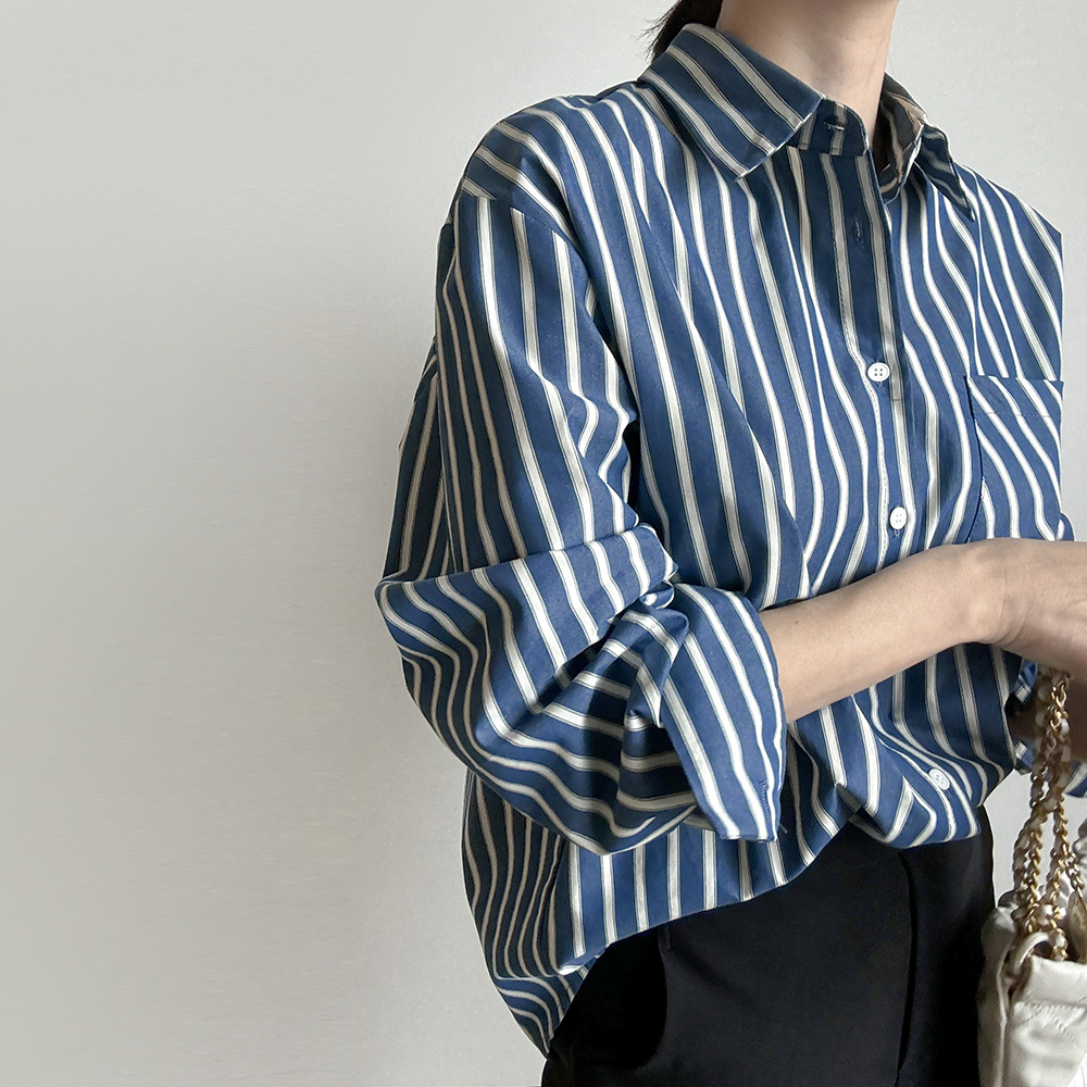蓝色条纹衬衫女春季新款时尚单排扣长袖百搭显瘦衬衣上衣竖条纹