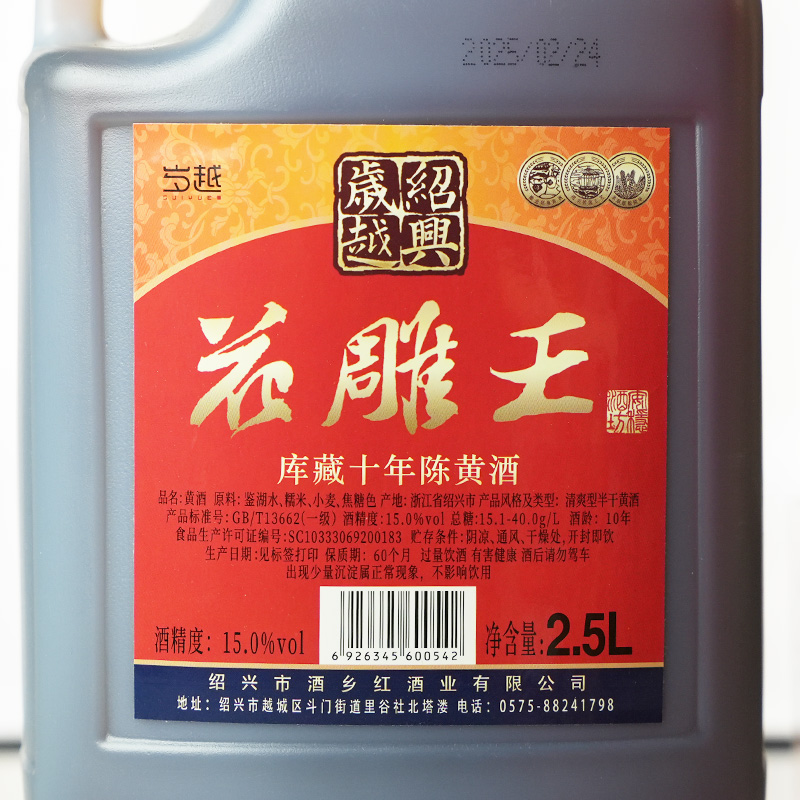 绍兴一级黄酒十年陈糯米花雕酒2.5L桶装15度自饮加饭老酒做菜料酒