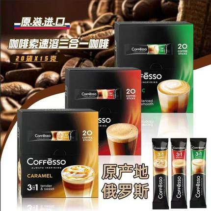 咖啡索牌俄罗斯原装进口速溶冲饮三合一特浓焦糖经典独立条装挂耳