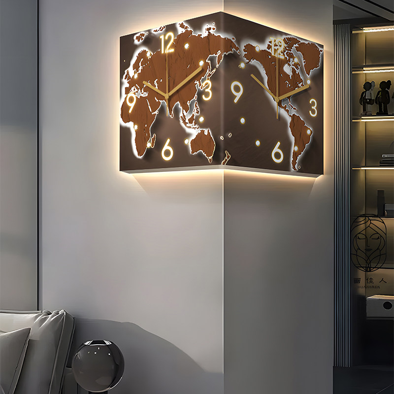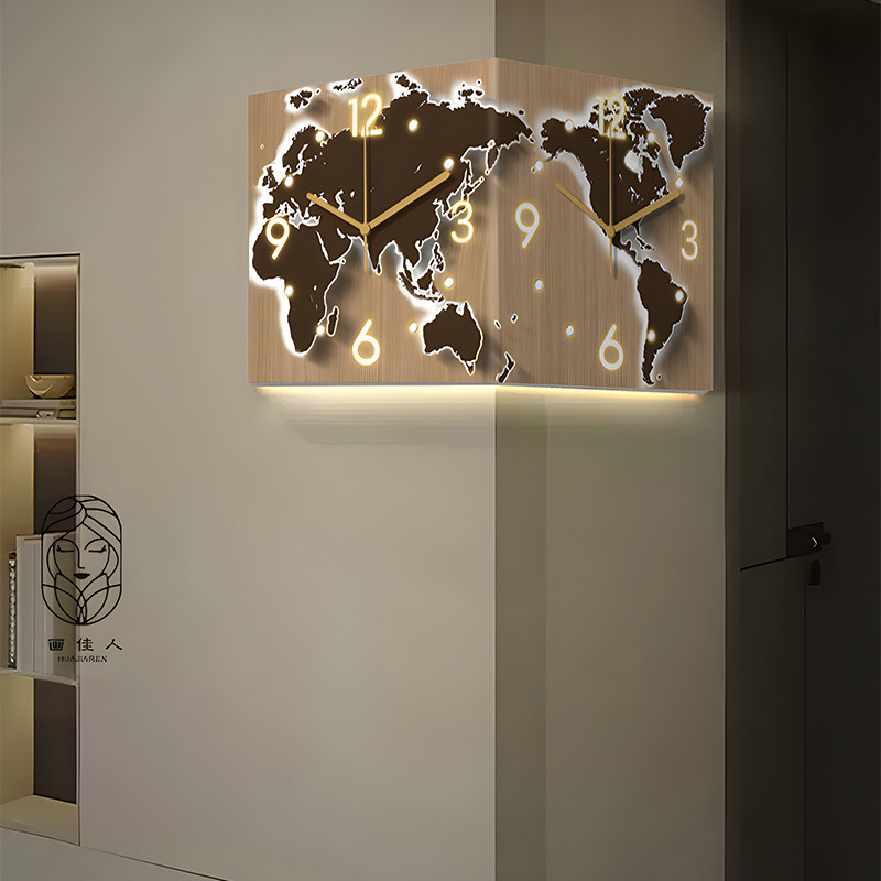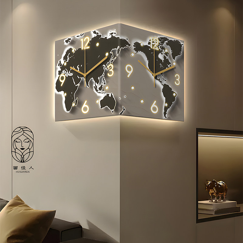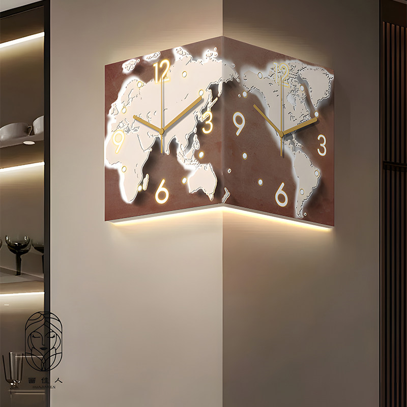 地图墙角拐转角时钟装饰画轻奢高级感创意钟表客厅极简挂画双面钟