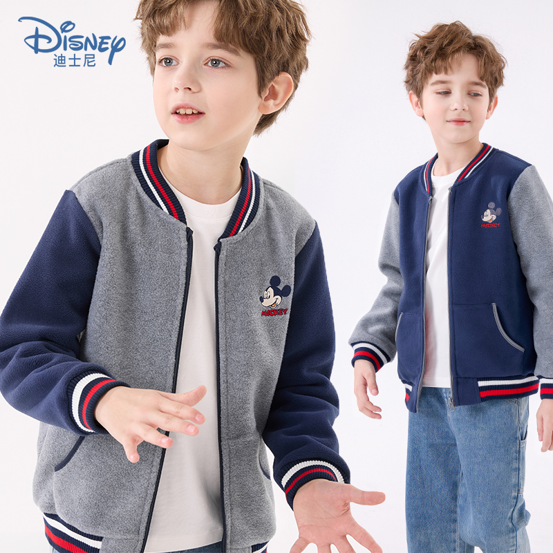 迪士尼男童外套春秋款儿童棒球服中大童摇粒绒卫衣夹克男孩上衣
