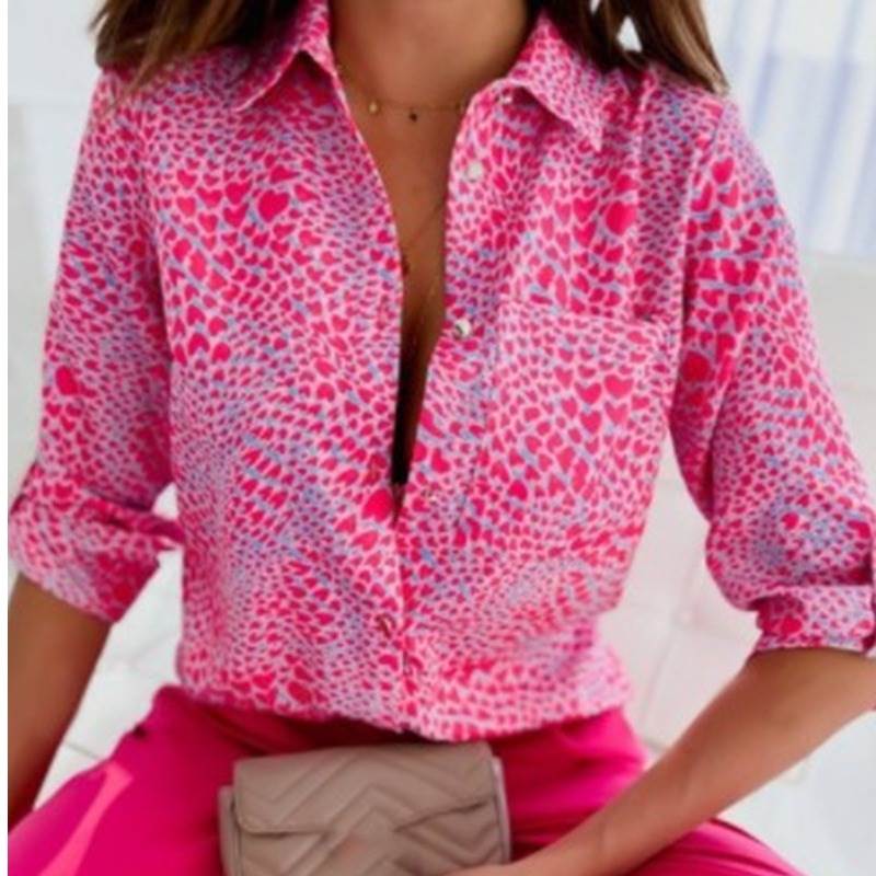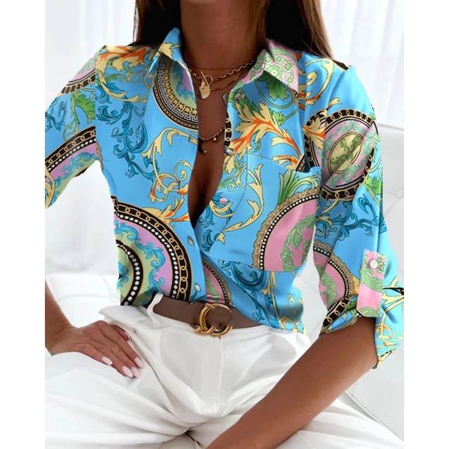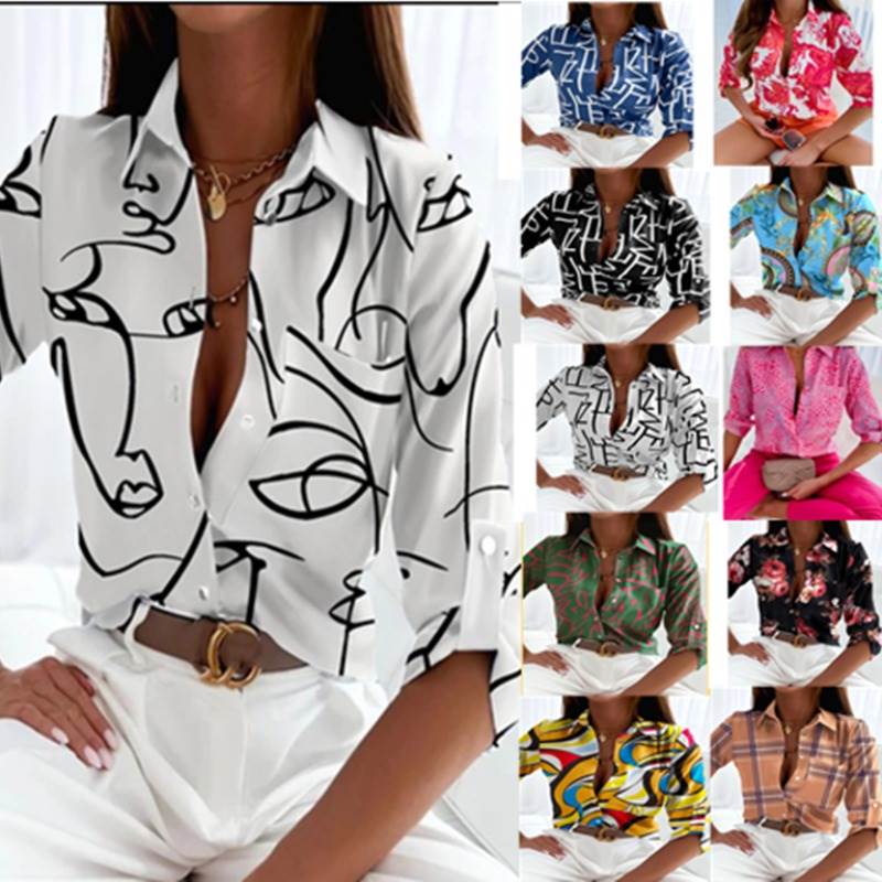 大码女装秋季通勤POLO领人物碎花字母印花胖MM单排扣长袖衬衫上衣