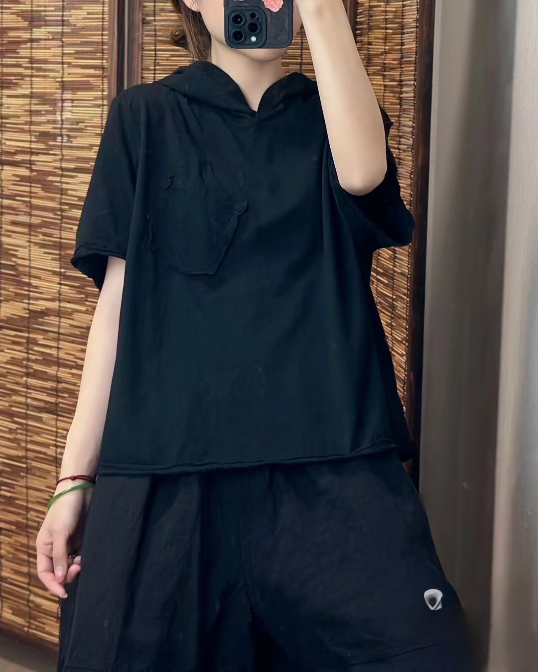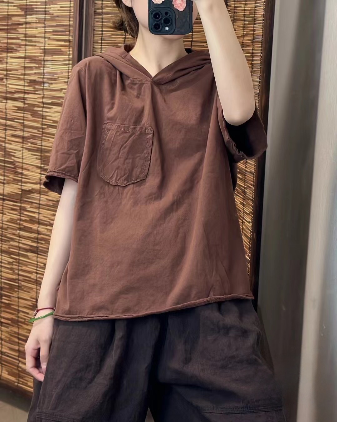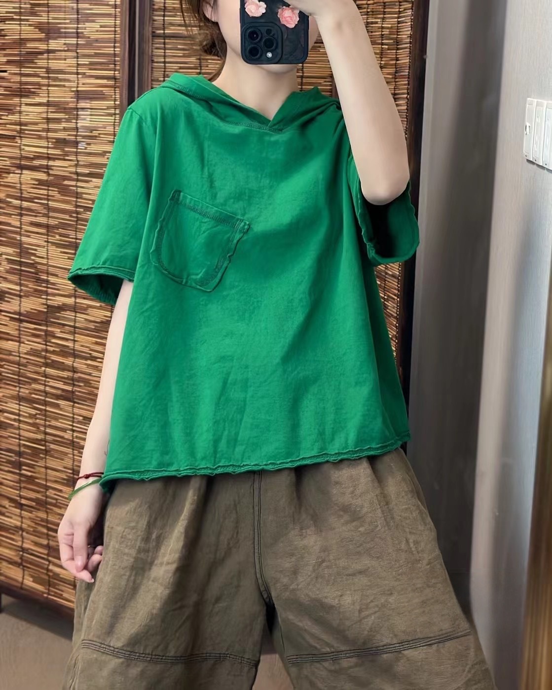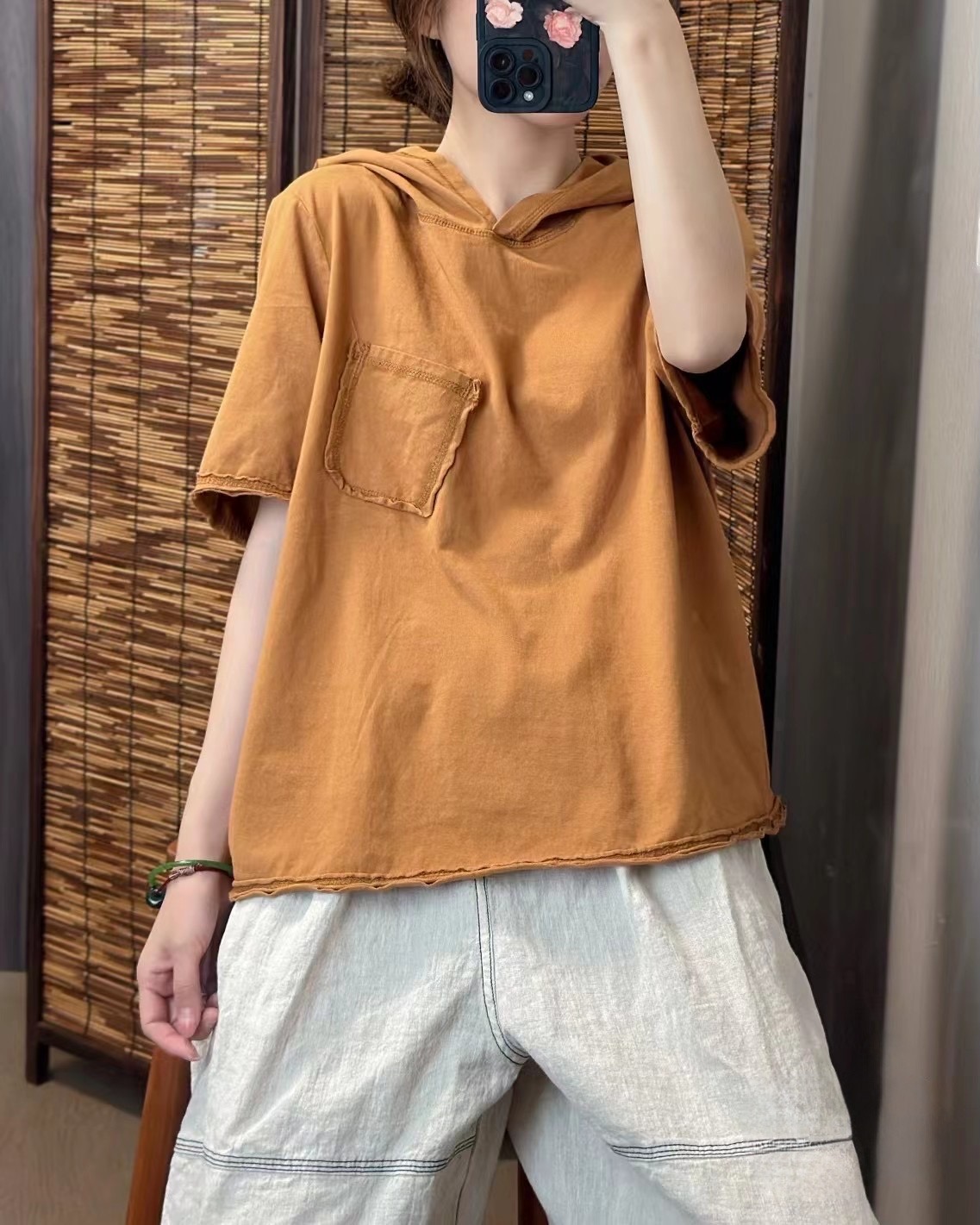 2025夏季纯棉水洗短袖连帽落肩纯色T恤衫女夏季宽松休闲百搭上衣