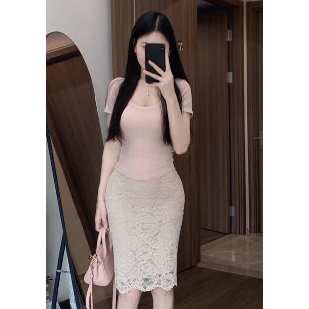 新款纯欲性感气质修身显瘦短袖微胖时尚蕾丝设计感包臀半身裙套装