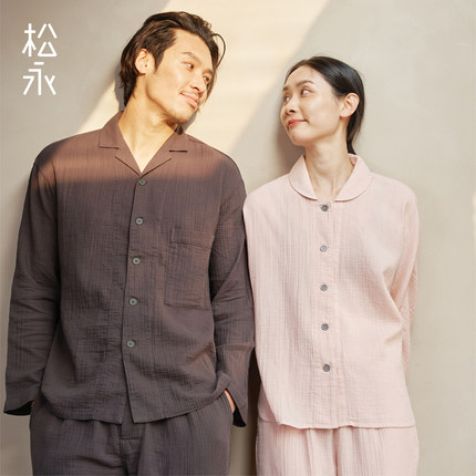 松永春夏男士女士纯棉双层纱睡衣长袖长裤柔软大气休闲家居服套装