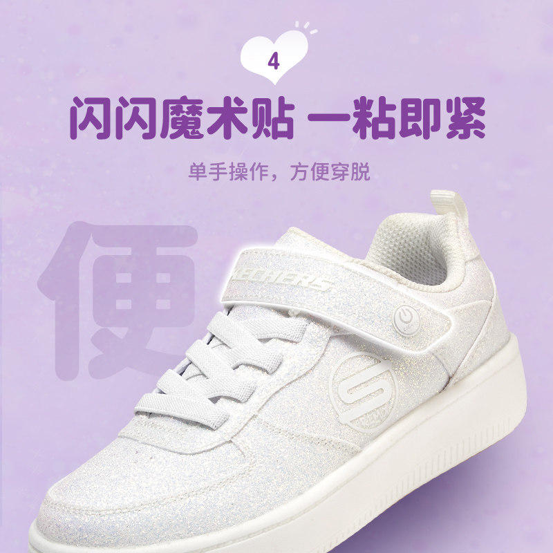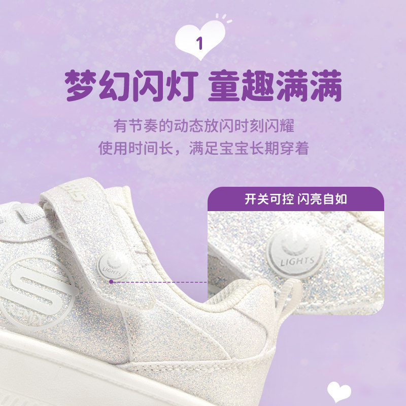 斯凯奇女大童鞋秋季闪灯珠光休闲鞋魔术贴小白鞋板鞋310102L-WHT