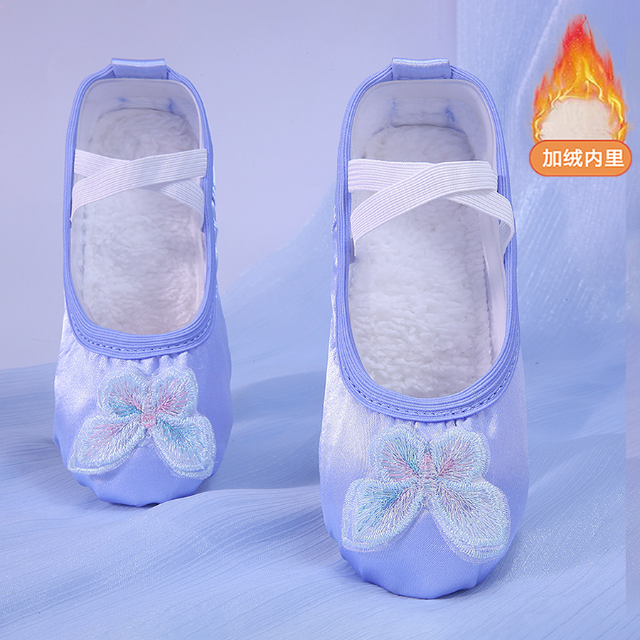 蓝色儿童跳舞蹈鞋加绒加厚免系带练功鞋女童冬季保暖软底中国练功