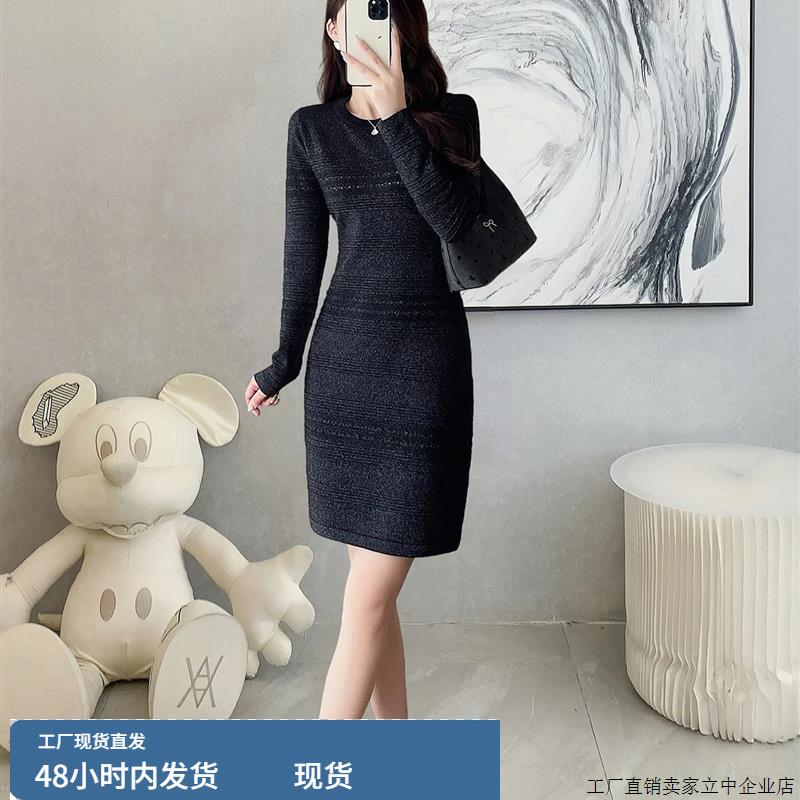 法式黑色针织圆领连衣裙女春秋新款高级感气质收腰显瘦长袖包臀裙