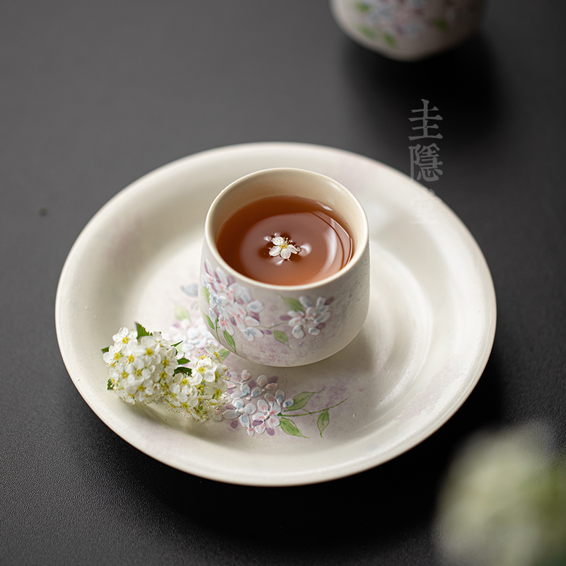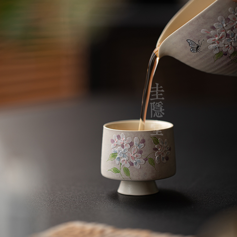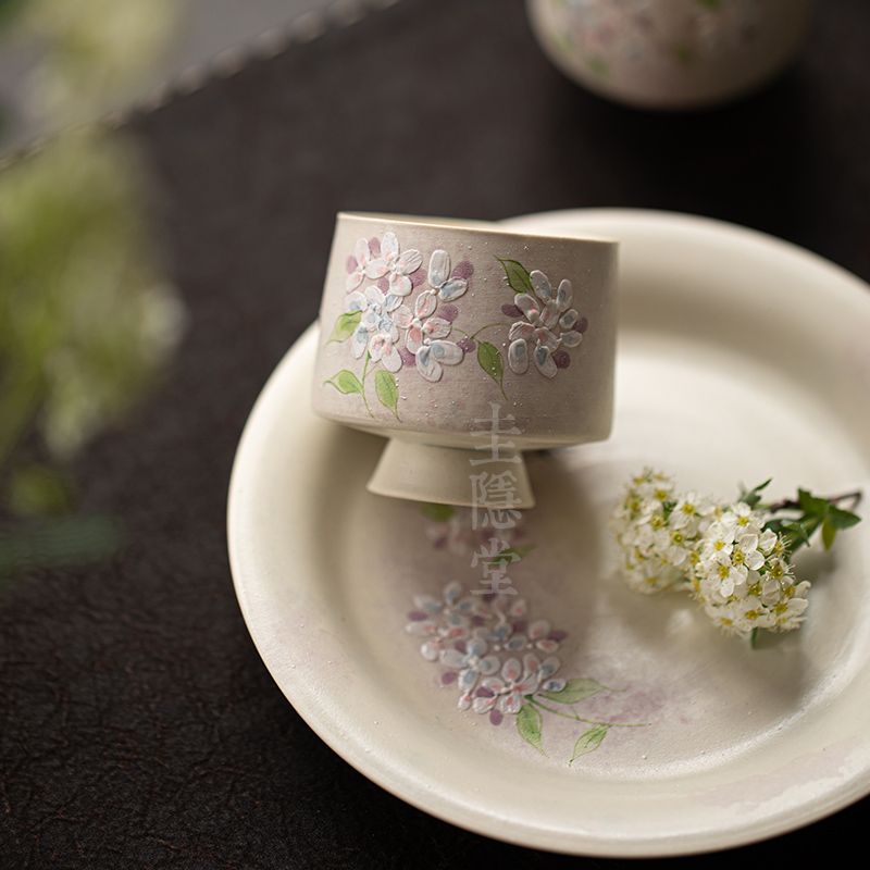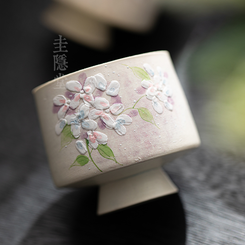 圭隐堂手绘绣球花堆雕陶瓷高足茶杯女士专用主人杯家用品茗杯单杯