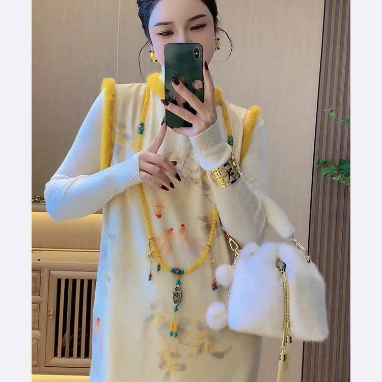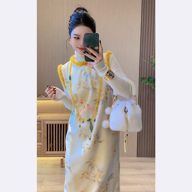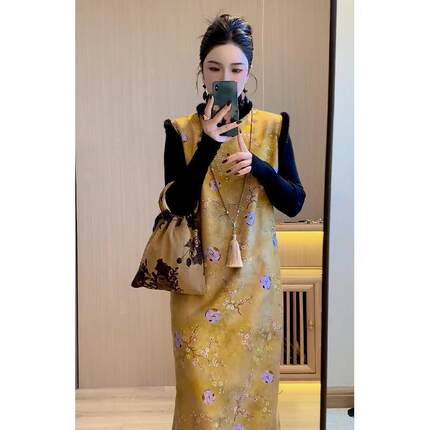 小洋装名媛高端加绒加厚新中式国风黄色毛领无袖背心旗袍连衣裙潮