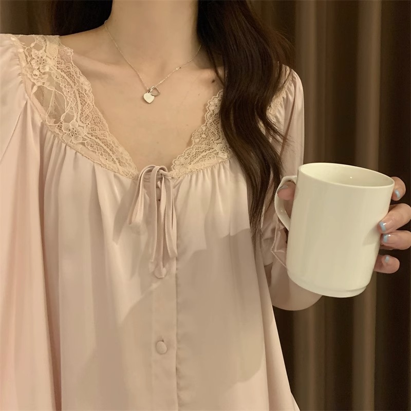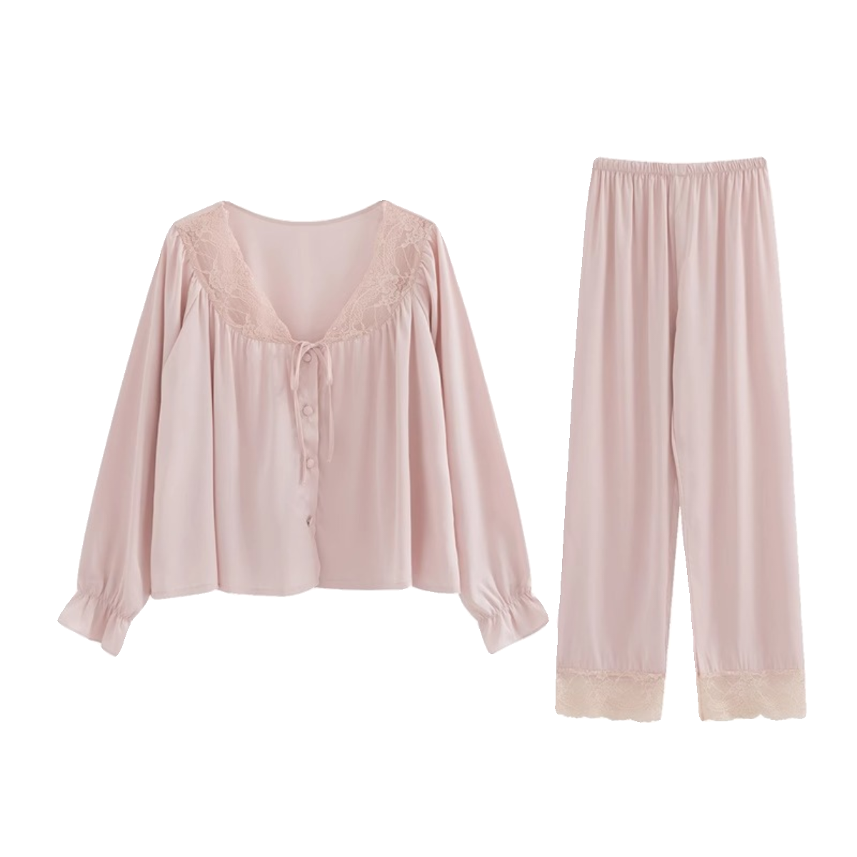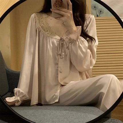 2023新款真丝睡衣女套装早秋V领蕾丝花边丝滑缎面花苞长袖家居服