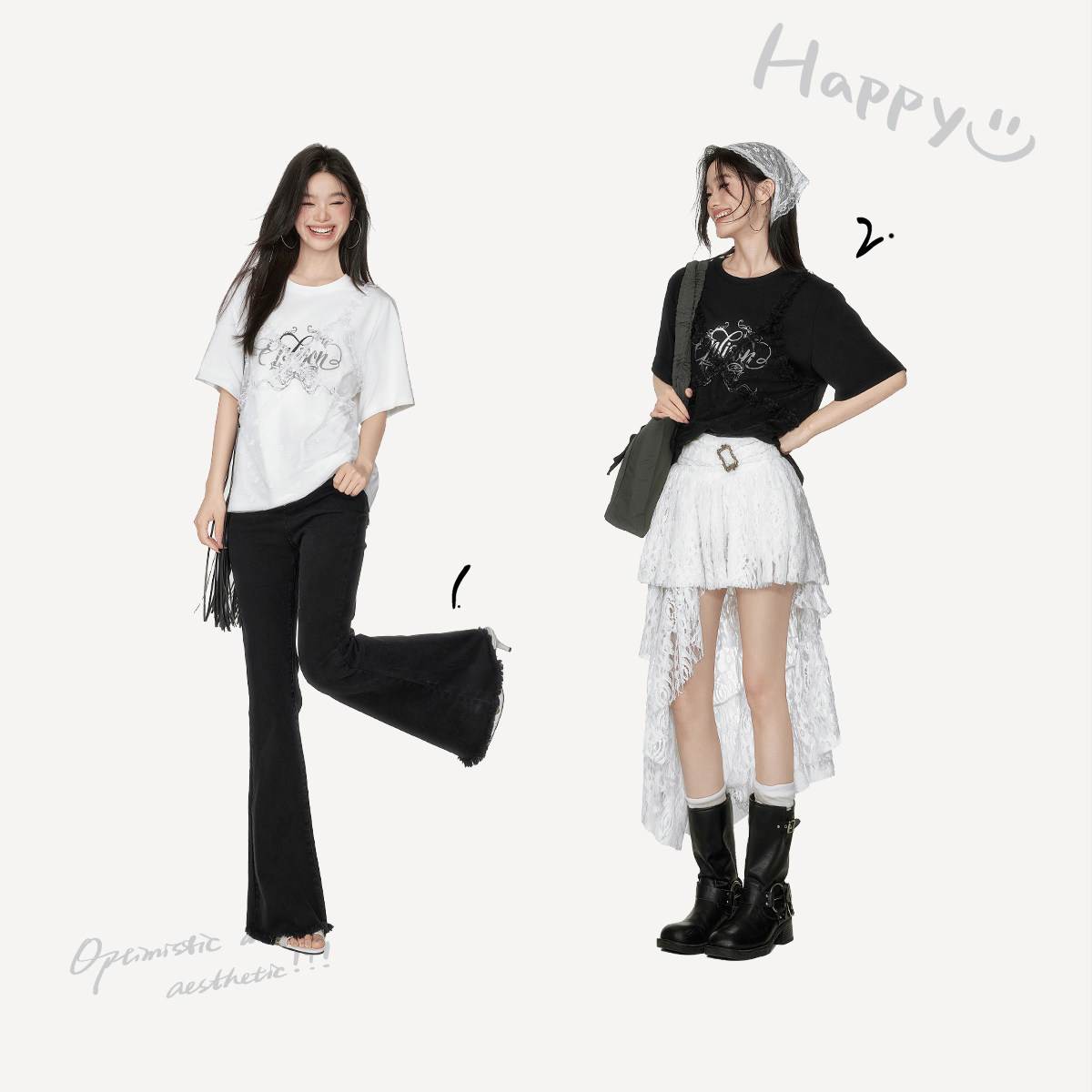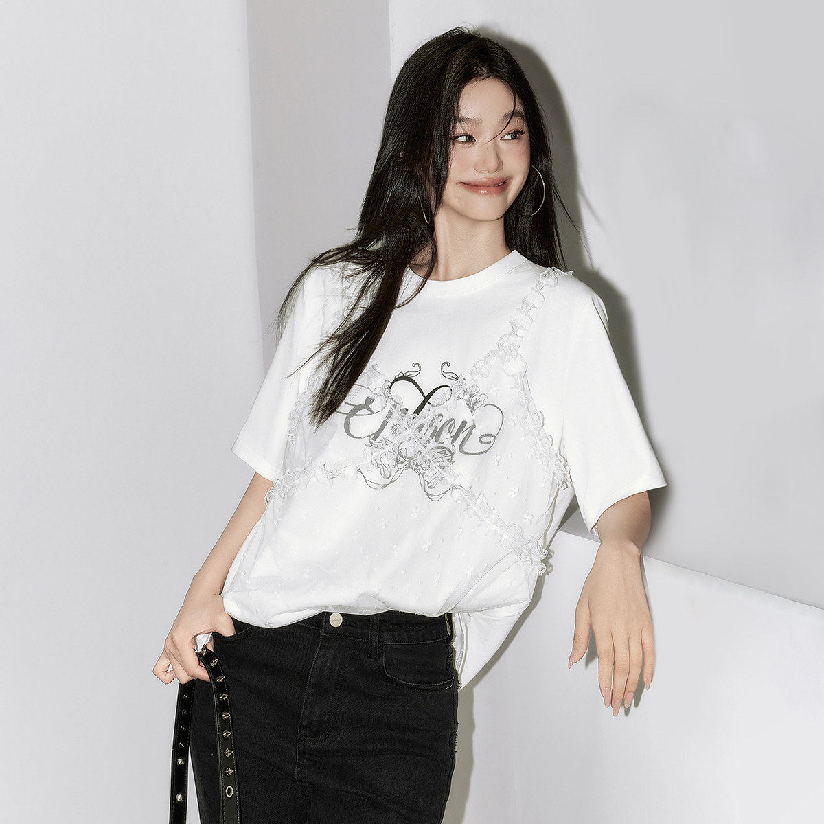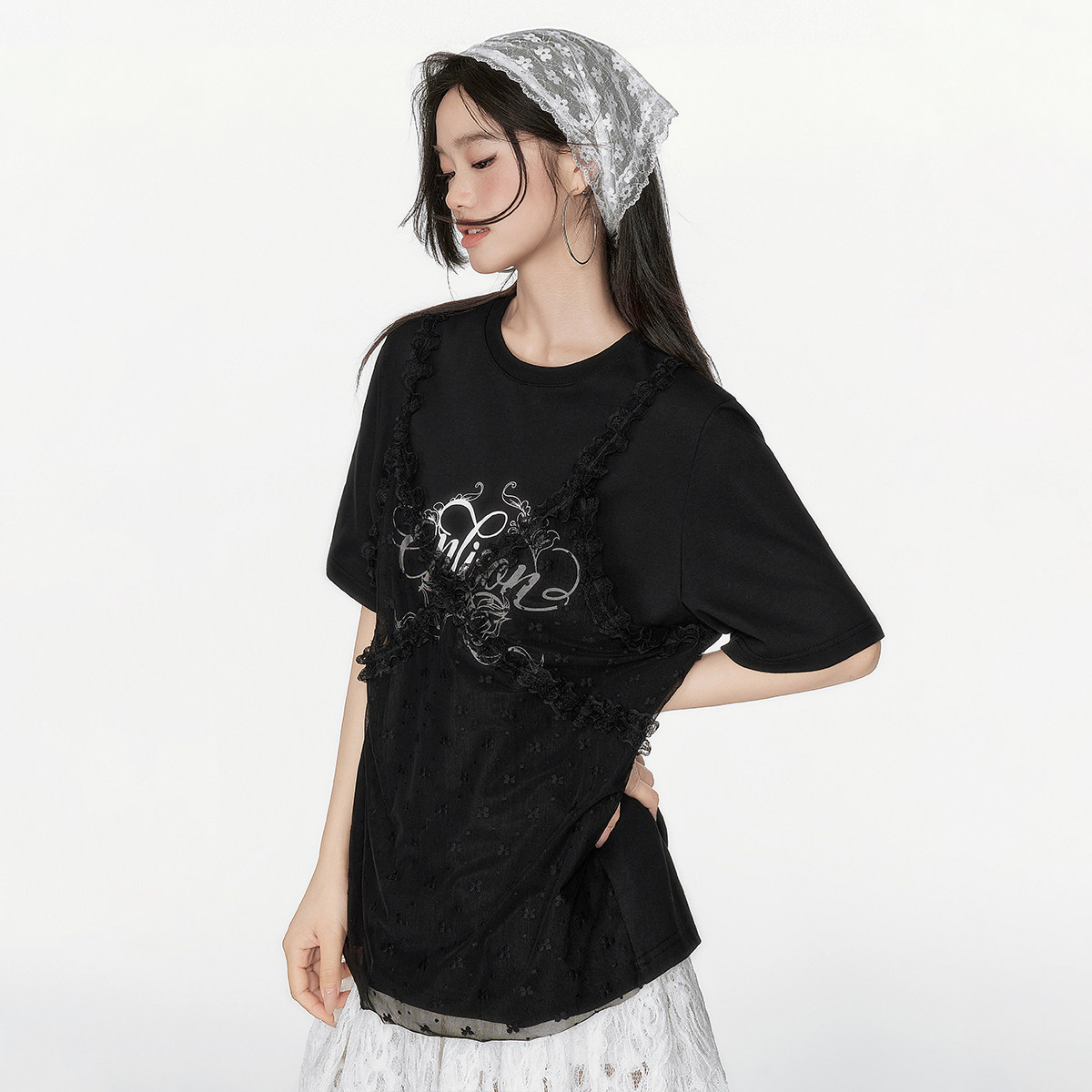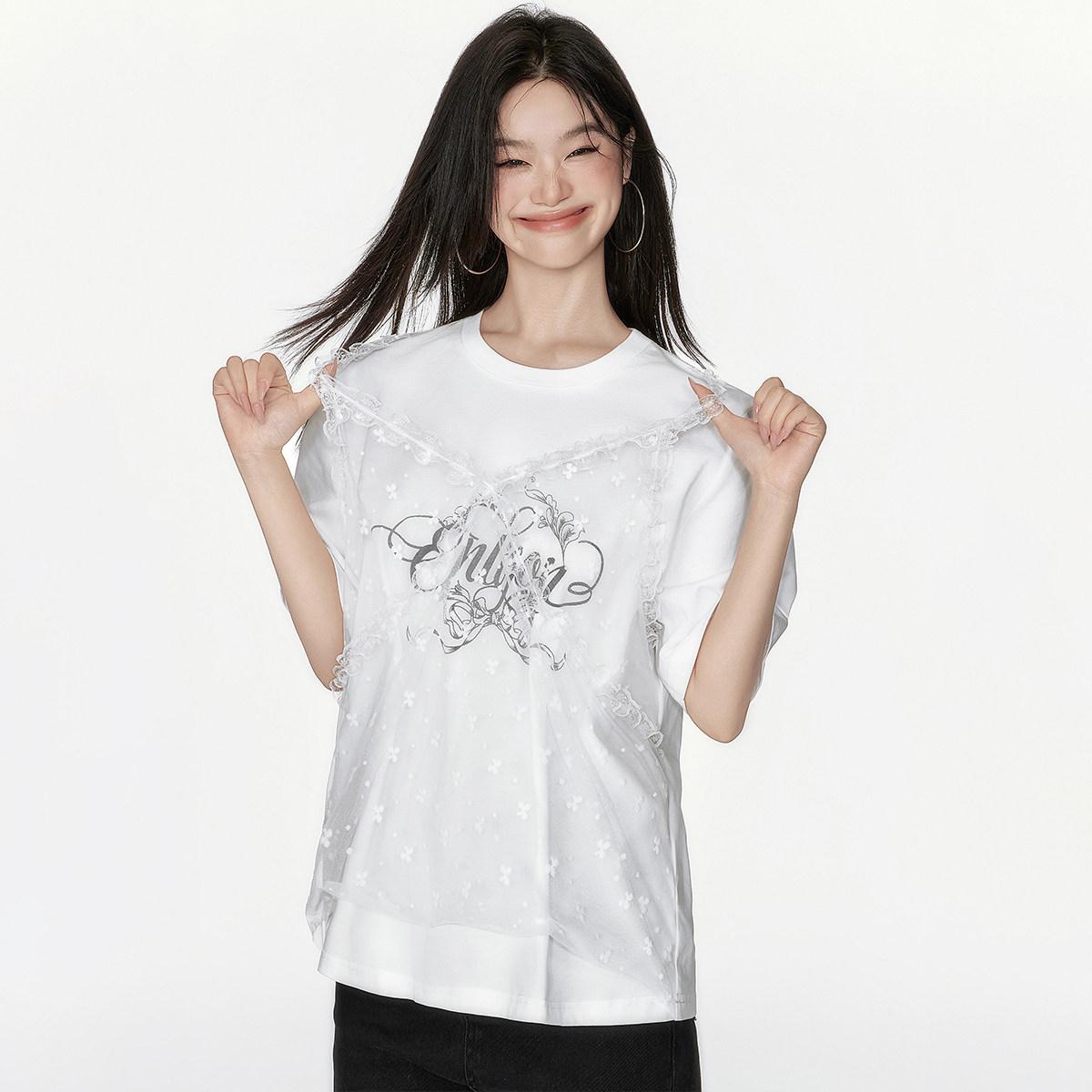 EPTISON短袖T恤女2025夏季新款复古独特假两件拼接蕾丝宽松上衣