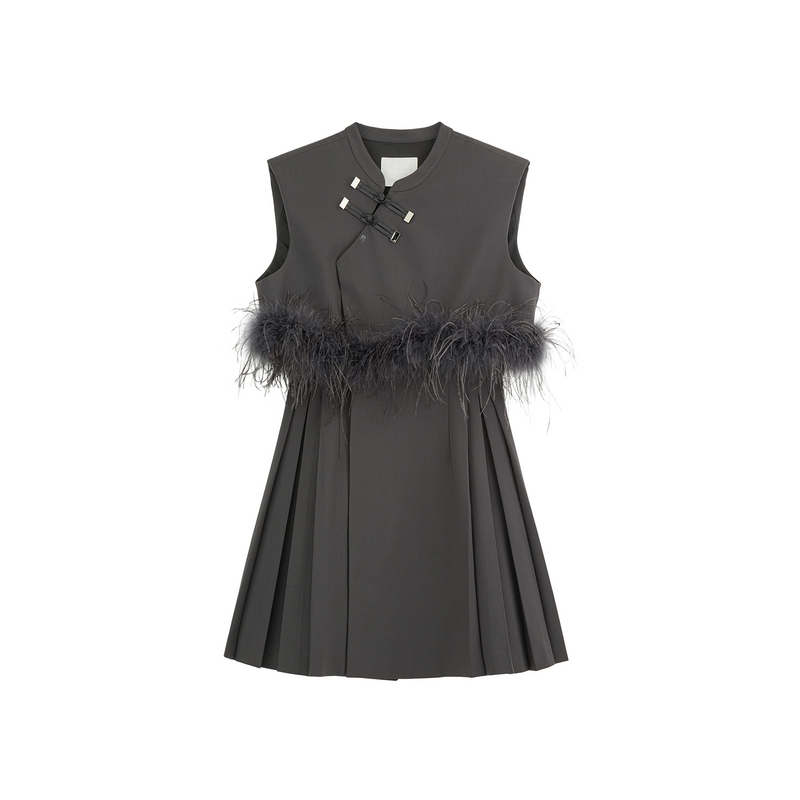 REVAN芮范2024秋季新品设计师款新中式毛条灰色连衣裙RM71101150