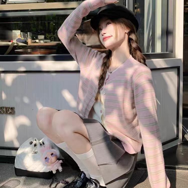 韩系甜美学院风假两件条纹针织开衫套装女早秋爆款慵懒外套百褶裙