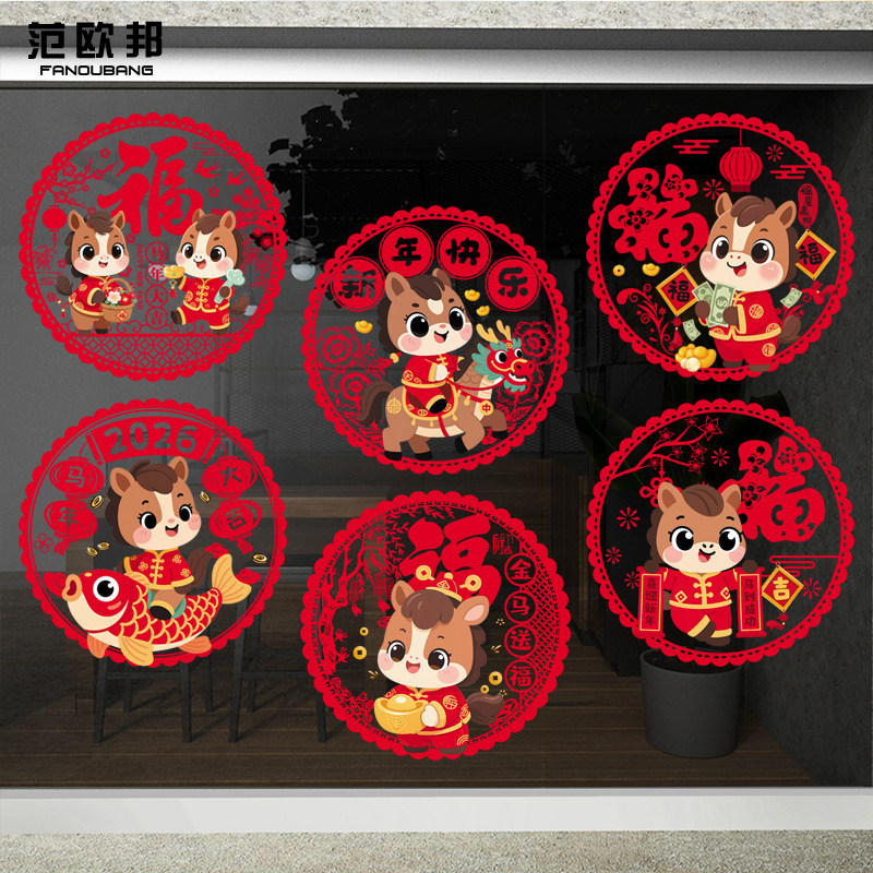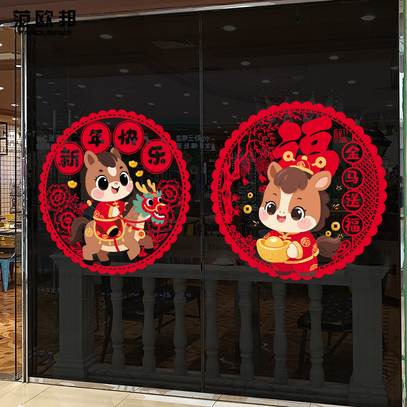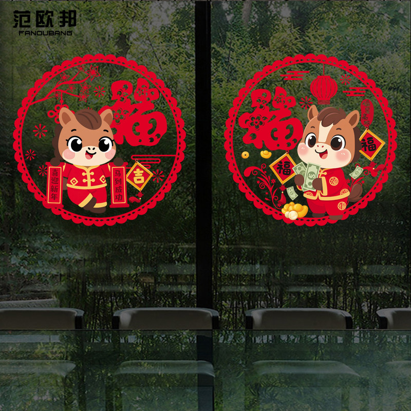 2026新年装饰玻璃门静电贴纸马年可爱贴画店铺推拉门厨房春节窗花