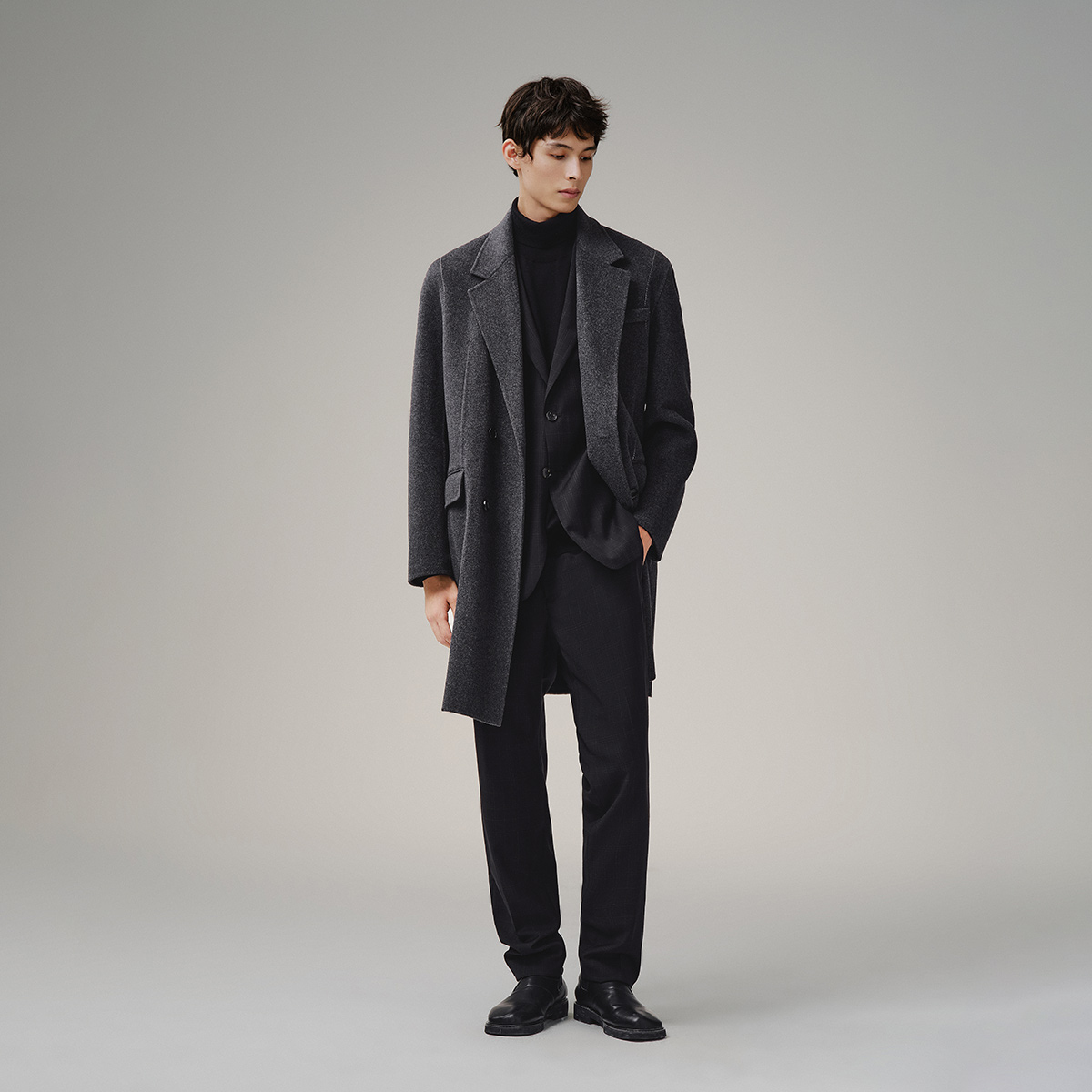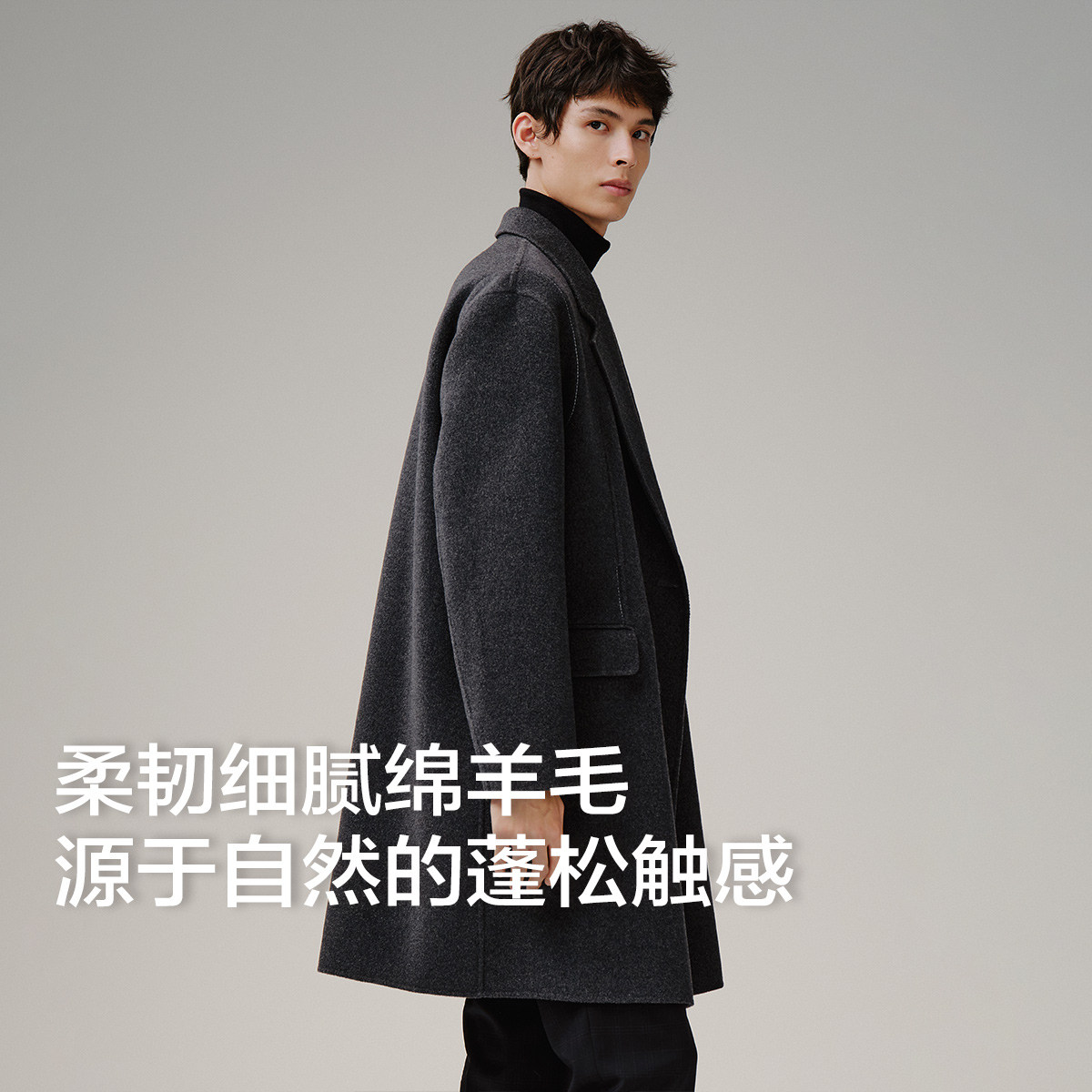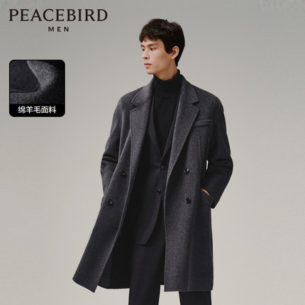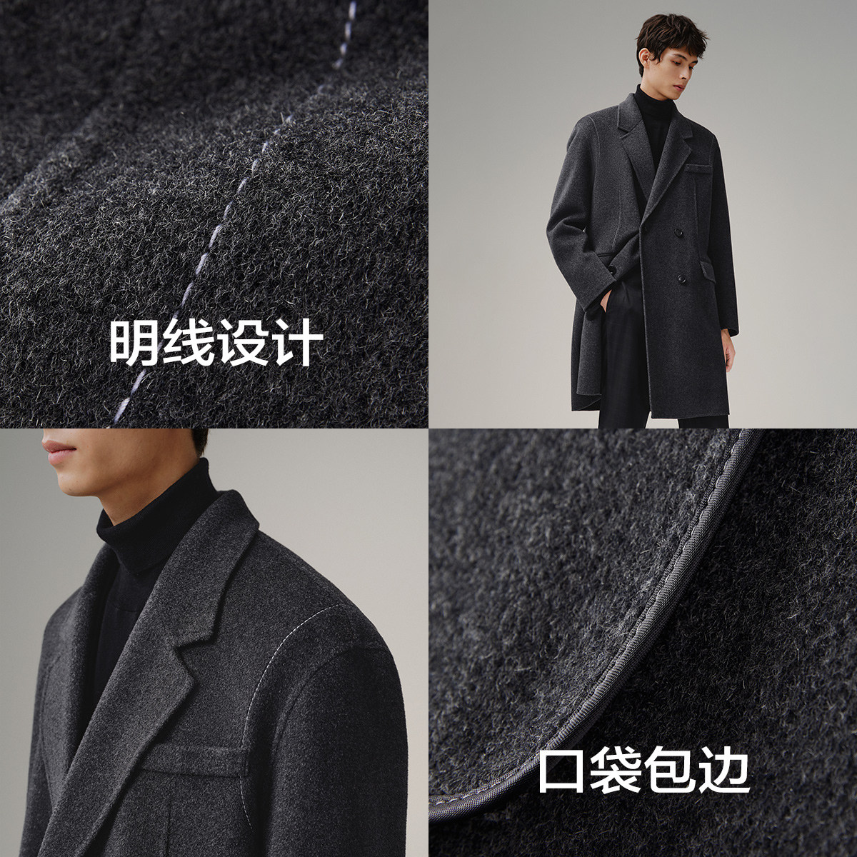 太平鸟男装明线双排扣羊毛大衣2023冬季新款休闲中长款双面呢外套