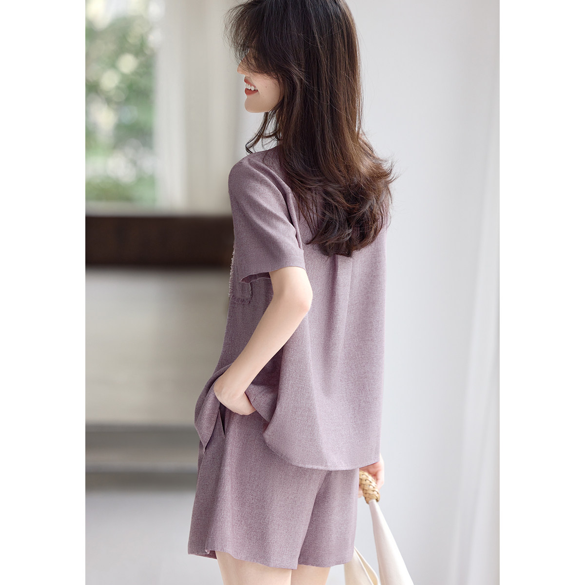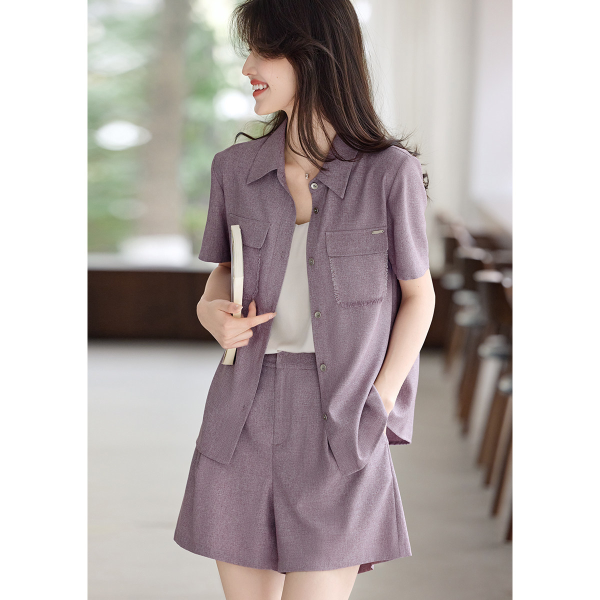 XWI欣未老钱小香风衬衫短裤套装女夏季气质优雅时髦温柔紫两件套