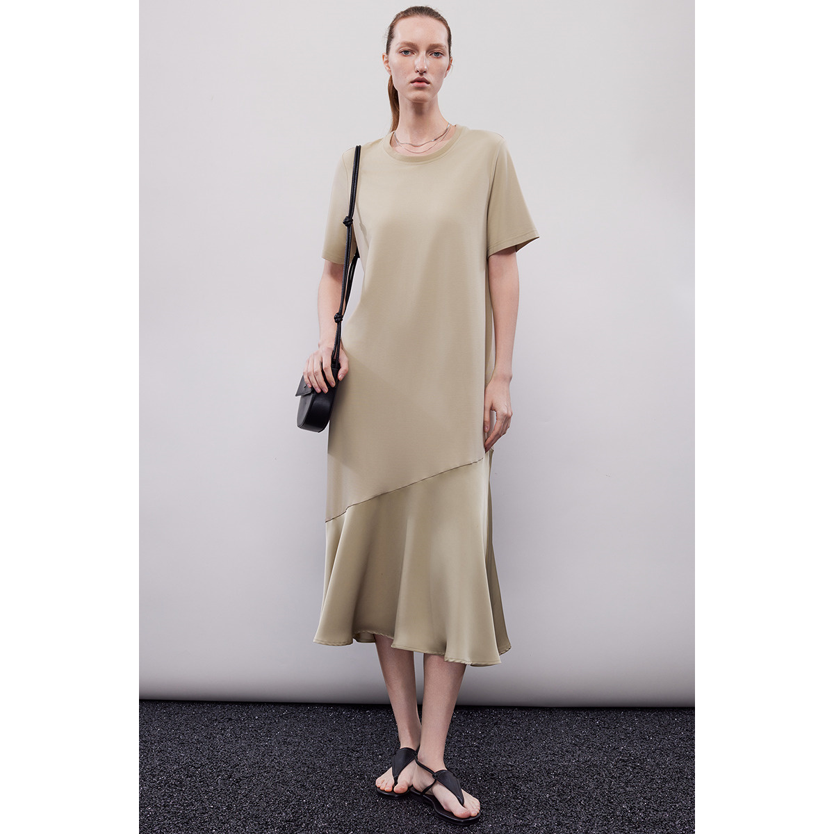 DKNY唐可娜儿夏季新款百搭气质优雅休闲拼接鱼尾针织短袖连衣裙