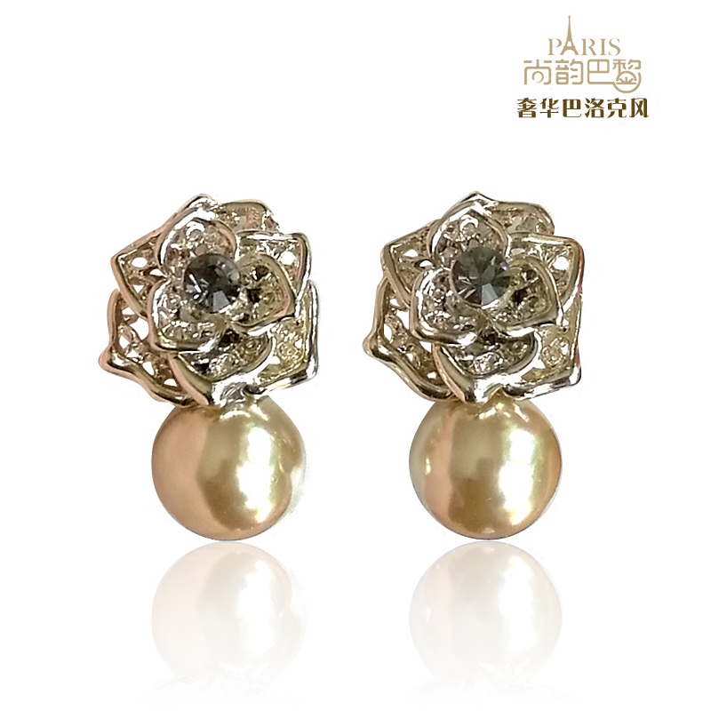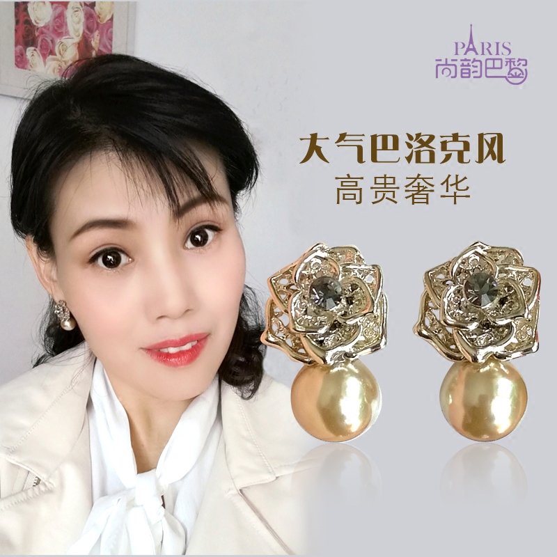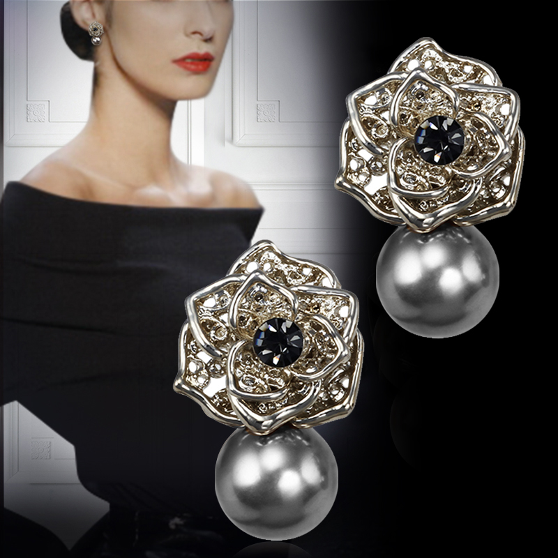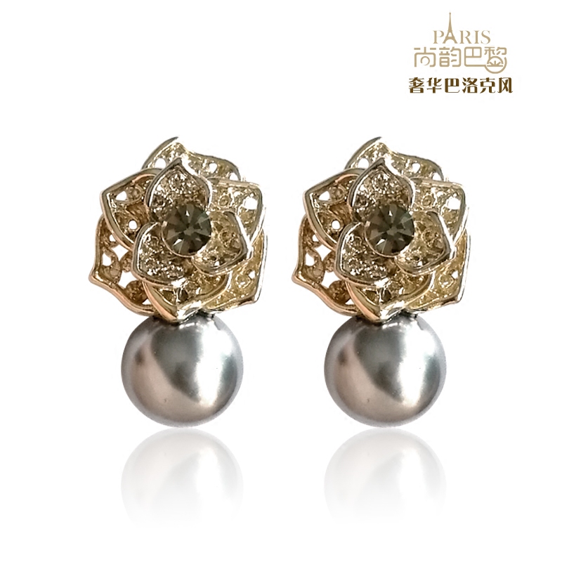 韩版夸张镂空玫瑰花气质珍珠大耳环保色复古个性灰珍珠耳饰耳钉女