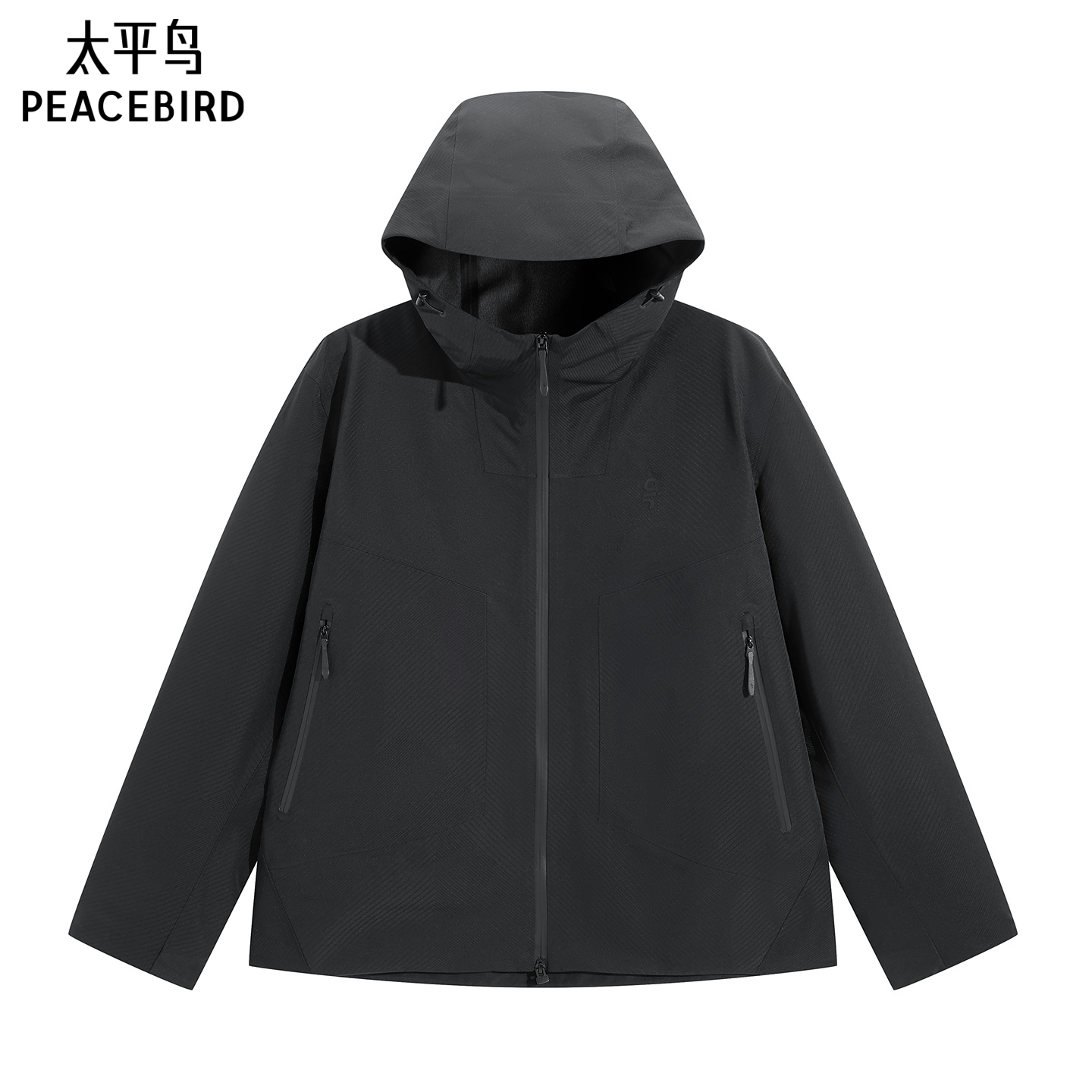 太平鸟男装 休闲夹克提花肌理合体黑色连帽男士冲锋衣外套