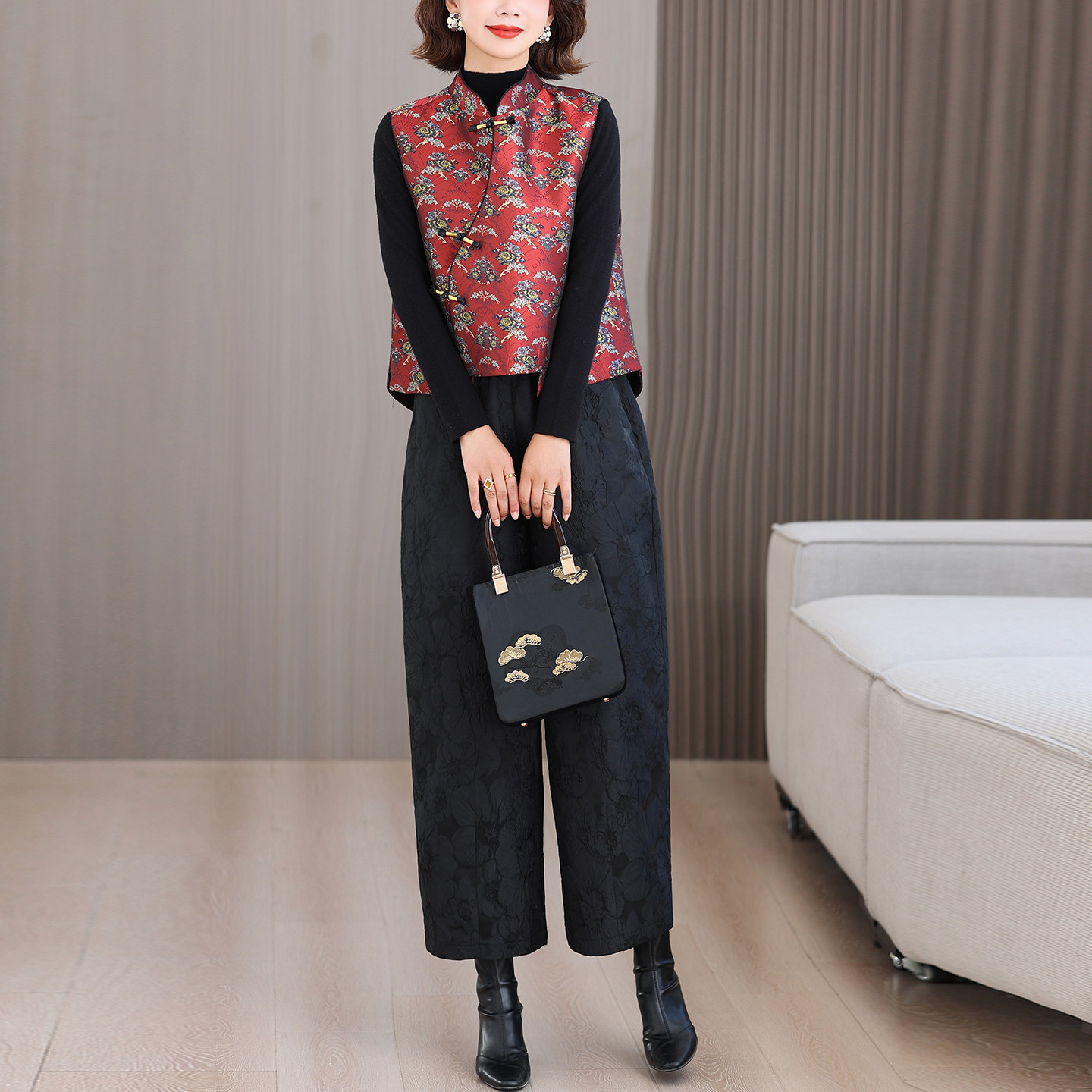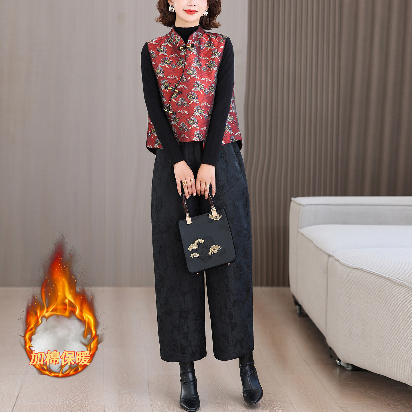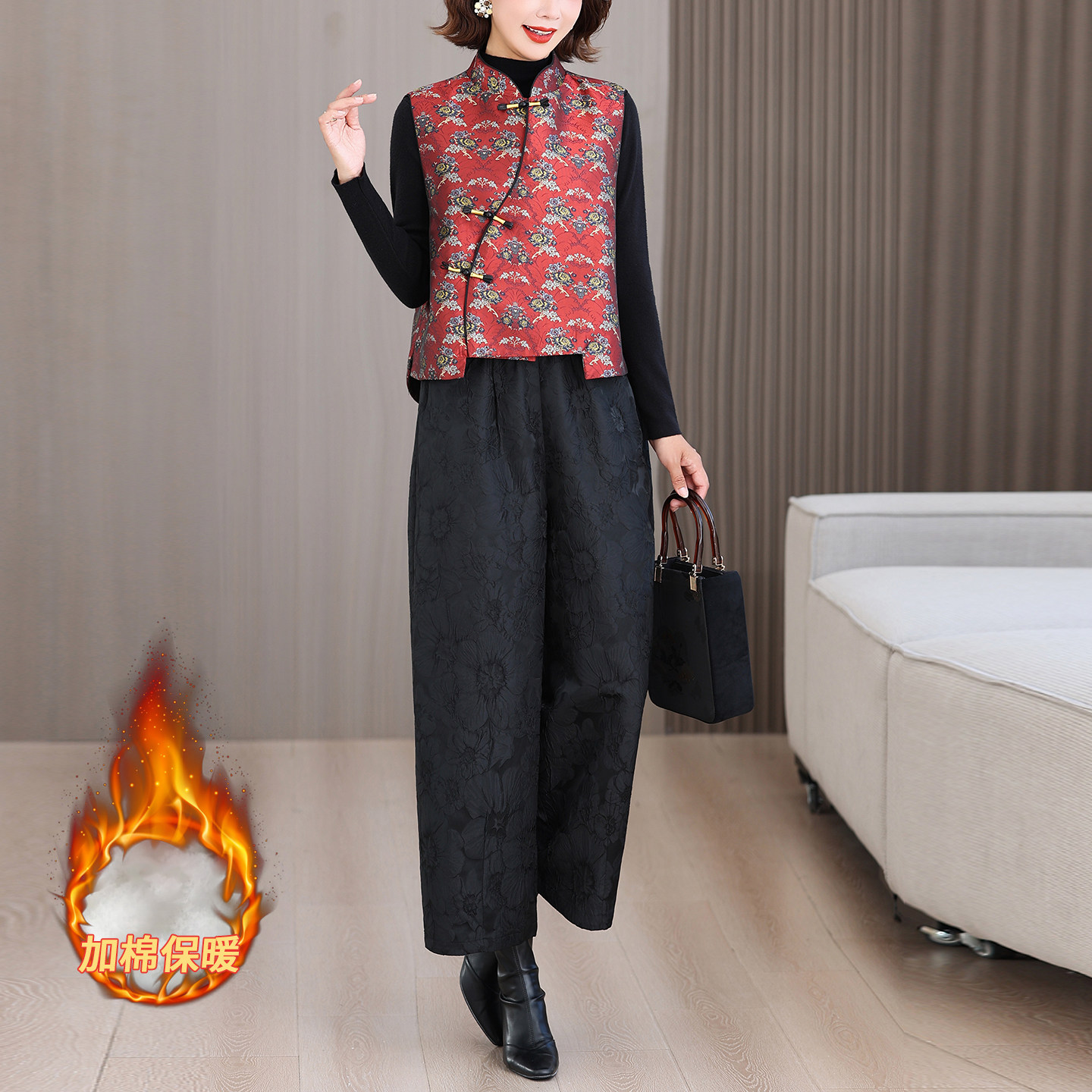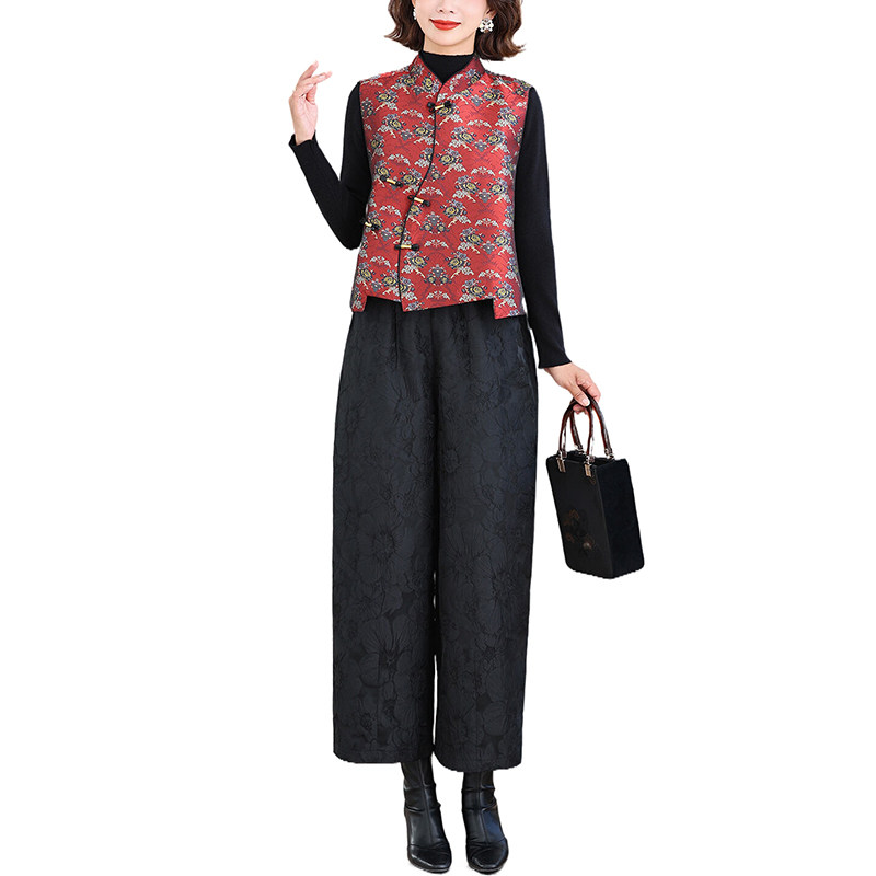 新中式国风秋冬季套装夹棉马甲斜襟盘扣上衣提花保暖阔腿裤两件套