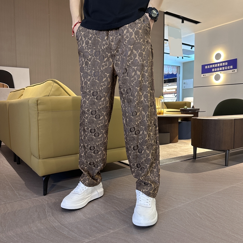 夏季薄款束脚裤冰丝透气休闲裤男士缎面醋酸九分裤时尚显瘦印花裤