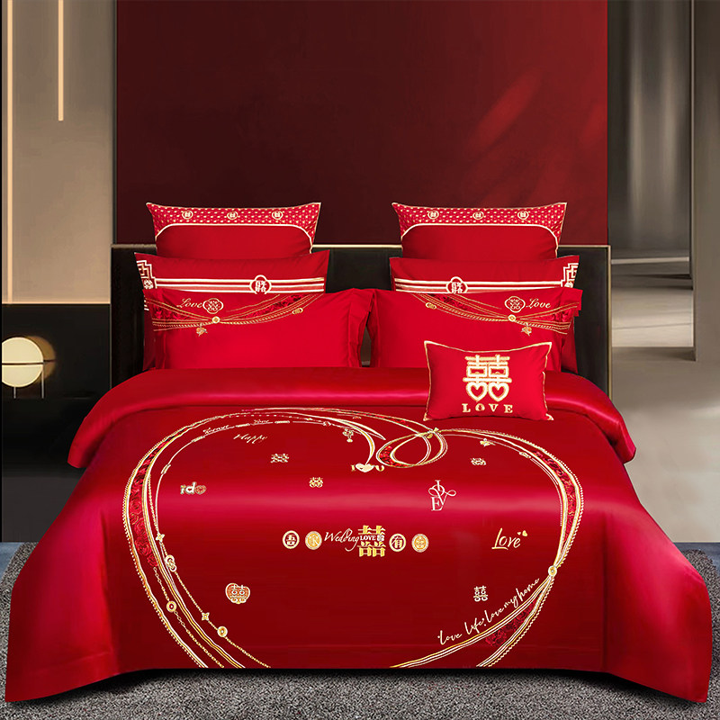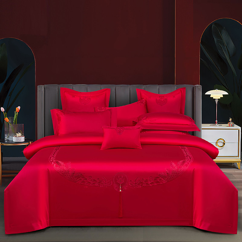 婚庆牀组被套四件套大红色全绣花简约婚房牀单结新婚被罩4件