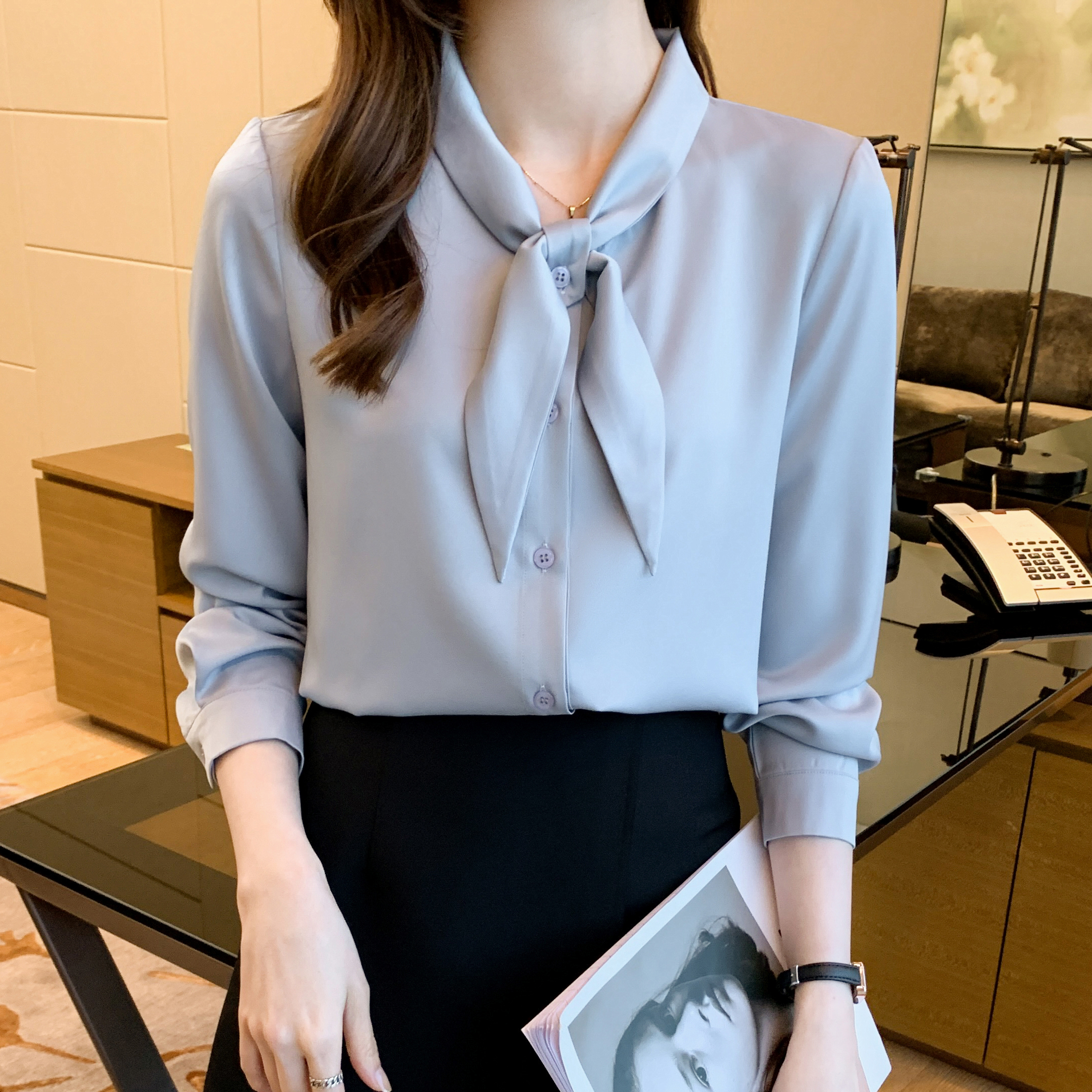 女装店冬装矮个子娇小150cm显高加小码缎面衬衫长袖职业飘带领结