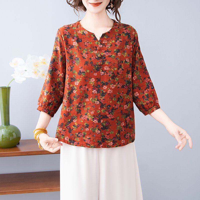 2025新款棉麻文艺小衫妈妈女碎花半袖宽松上衣薄款舒适减龄t恤夏