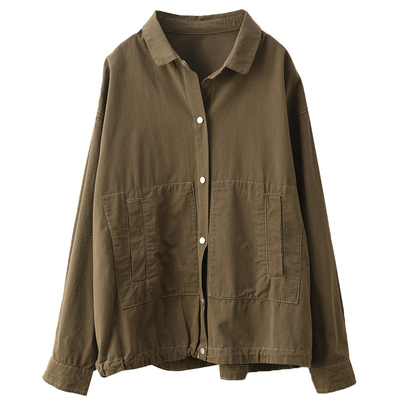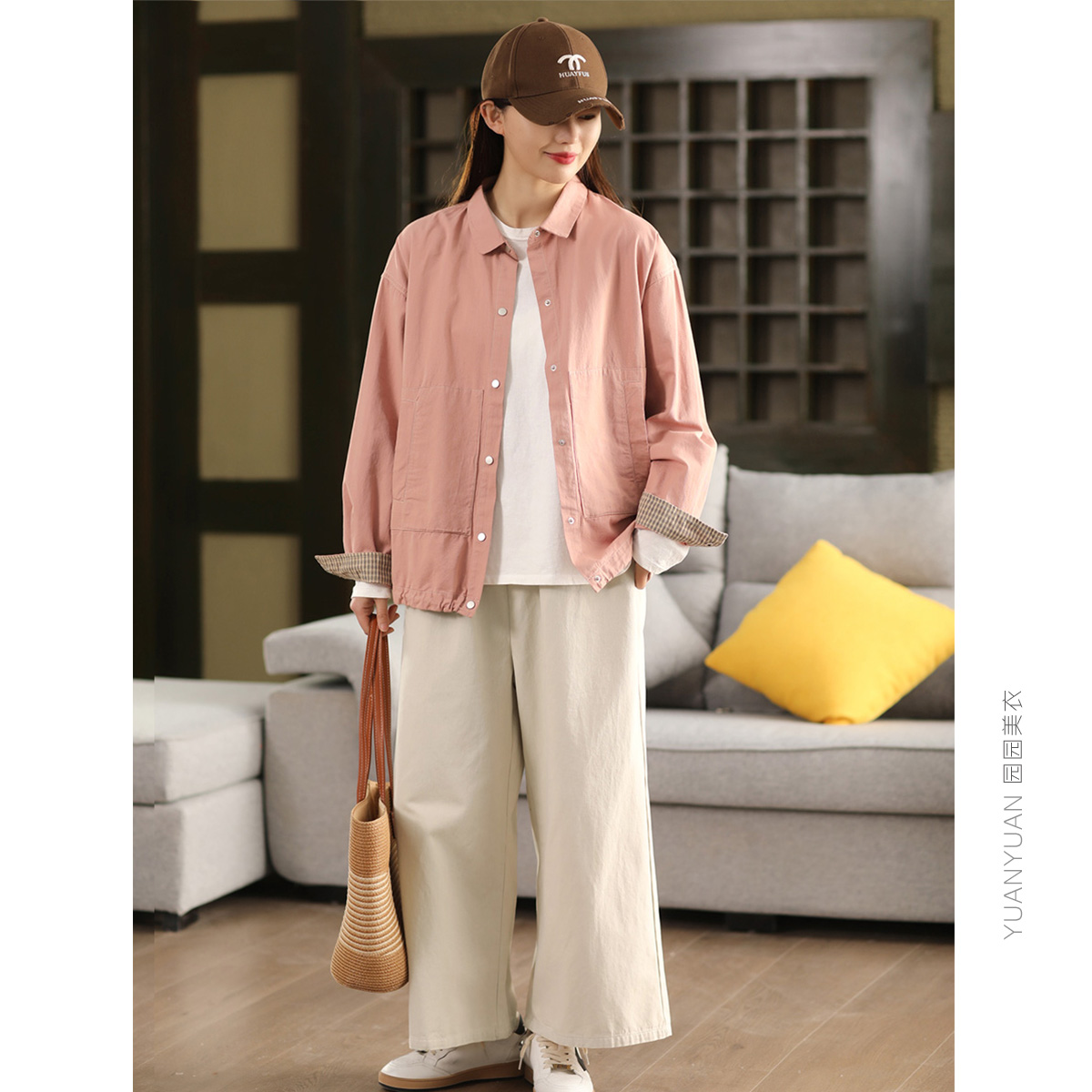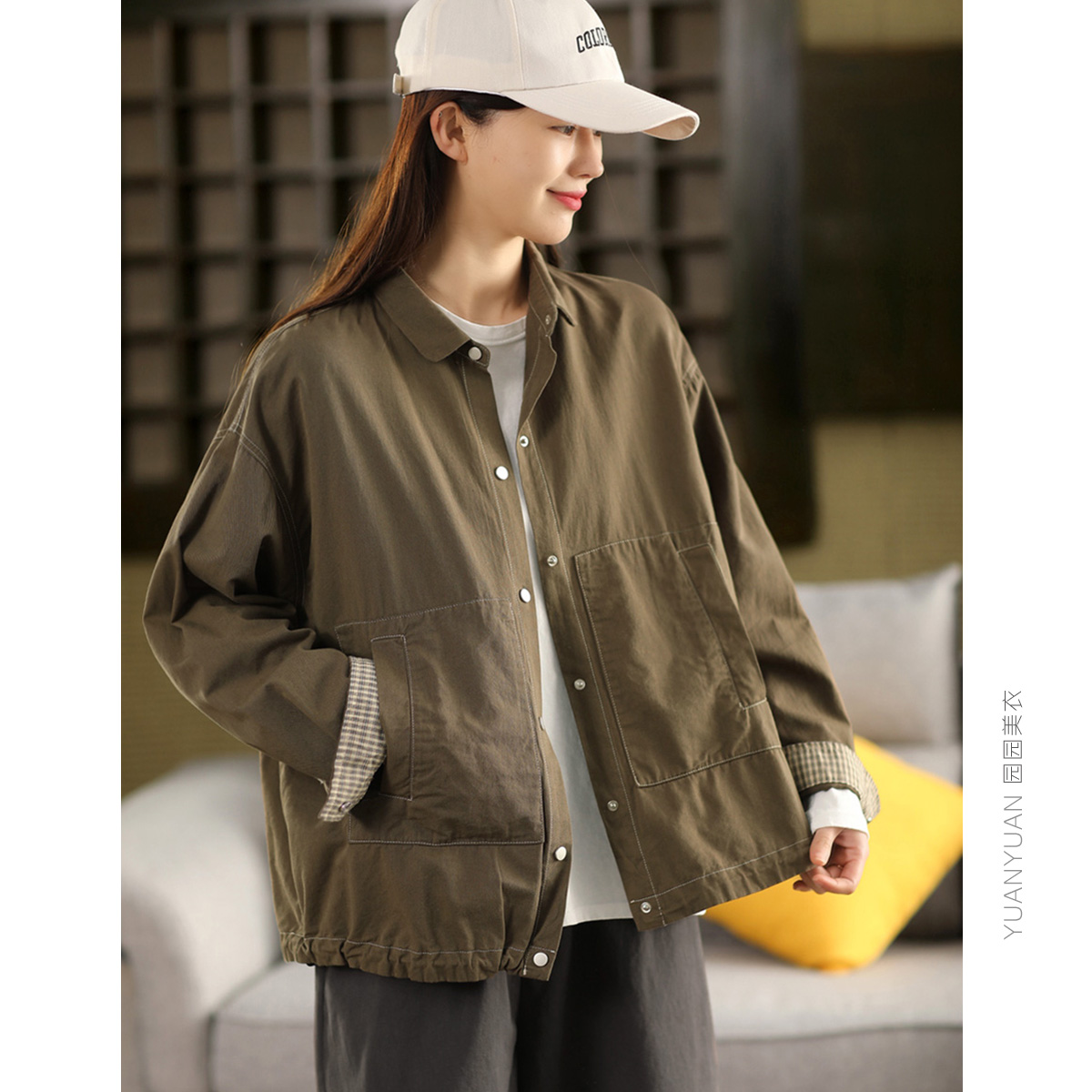 重工100%棉衬衫工装外套女拼接格纹长袖翻领开衫休闲外搭上衣春款