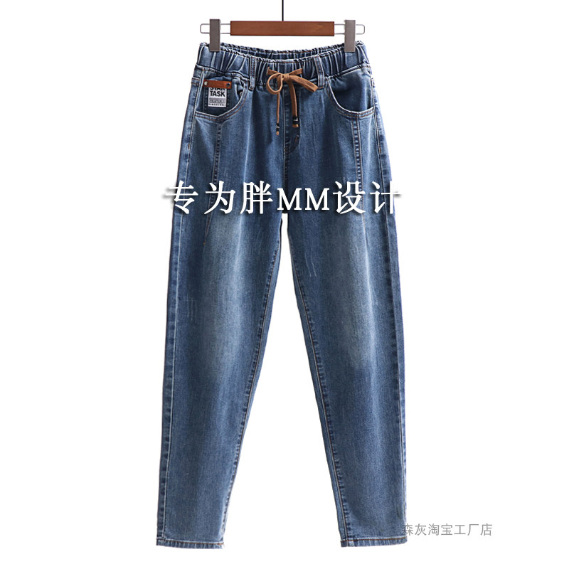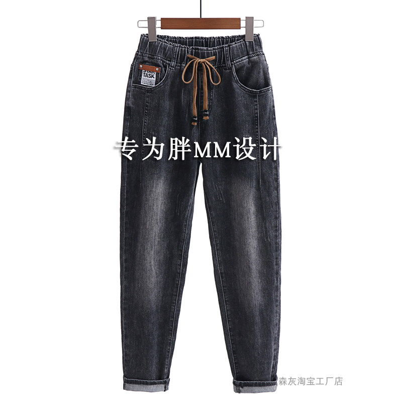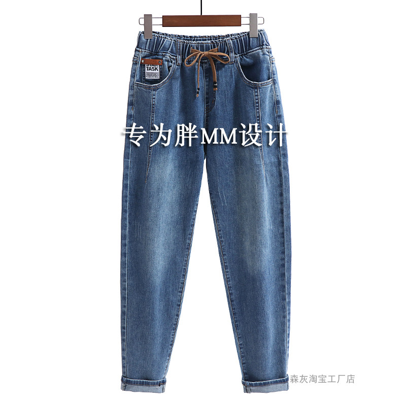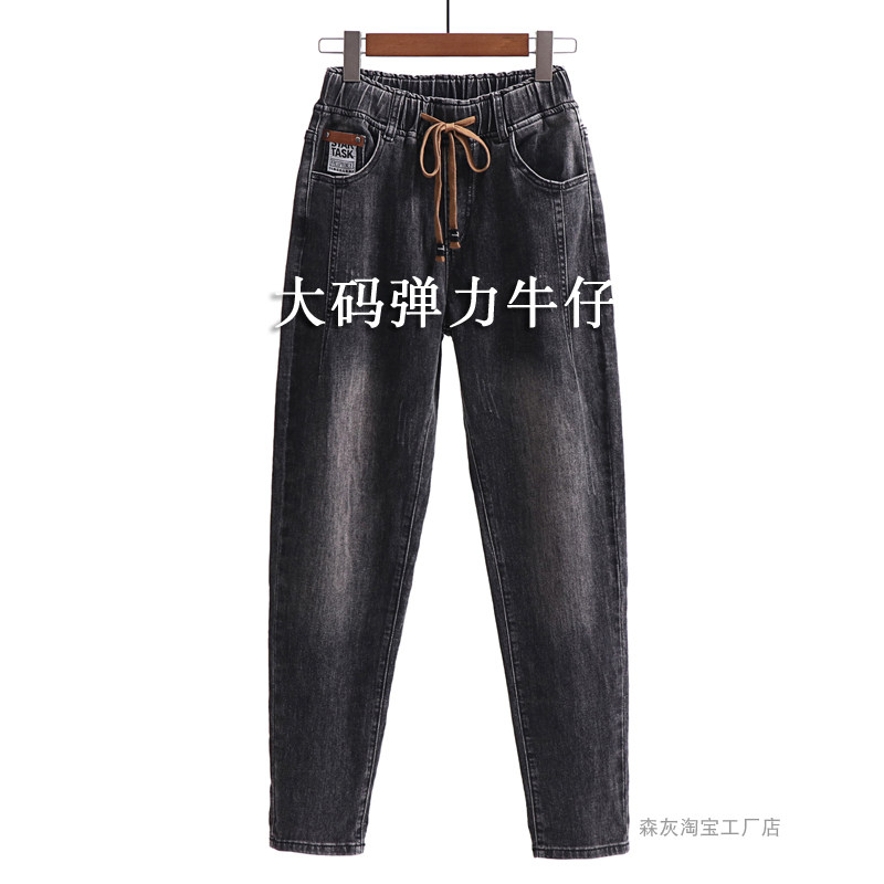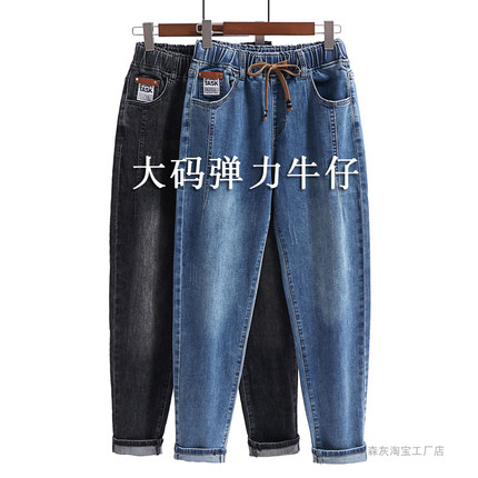 松紧腰牛仔裤女大码胖MM妈妈加绒裤子弹力哈伦裤高腰梨形身材裤子