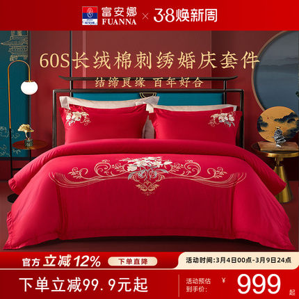 富安娜结婚四件套60支纯棉套件婚庆红色刺绣床单喜庆被套床上用品