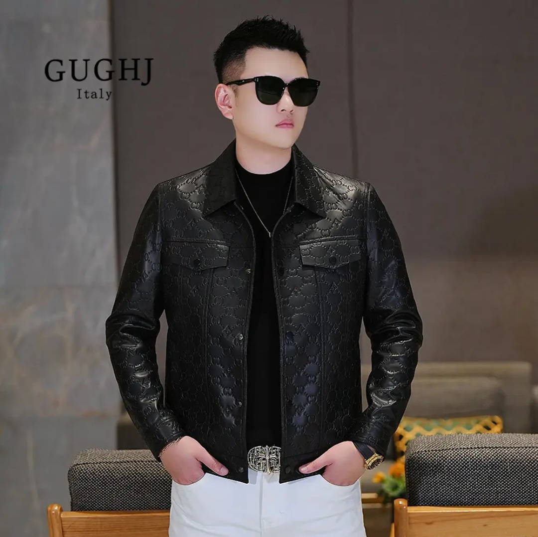秋冬潮牌绵羊皮压花翻领皮衣男士潮流时尚修身百搭轻奢痞帅外套