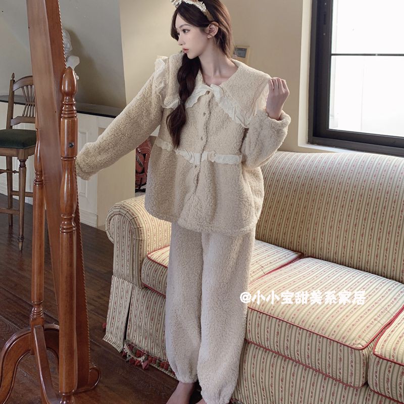 韩国羊羔绒睡衣女冬加厚保暖可爱娃娃领花边甜美网红珊瑚绒家居服