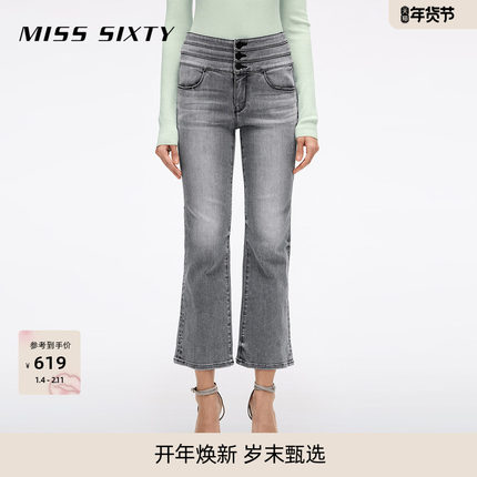 Miss Sixty春秋复古做旧浅灰色牛仔裤女三环高腰显瘦百搭微喇叭裤