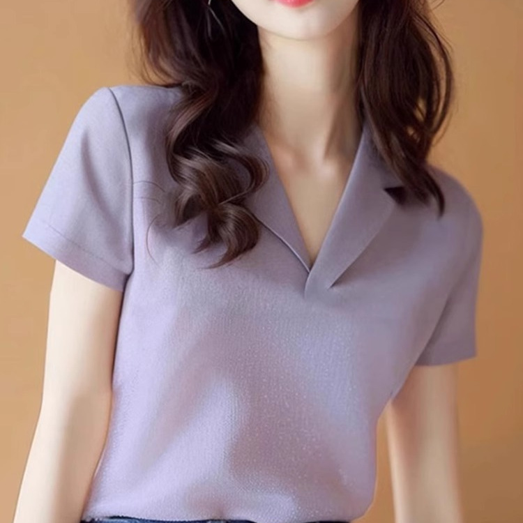 阿玛施正品2025年夏季新款纯色简约翻领正肩显瘦短袖套头t恤衫女