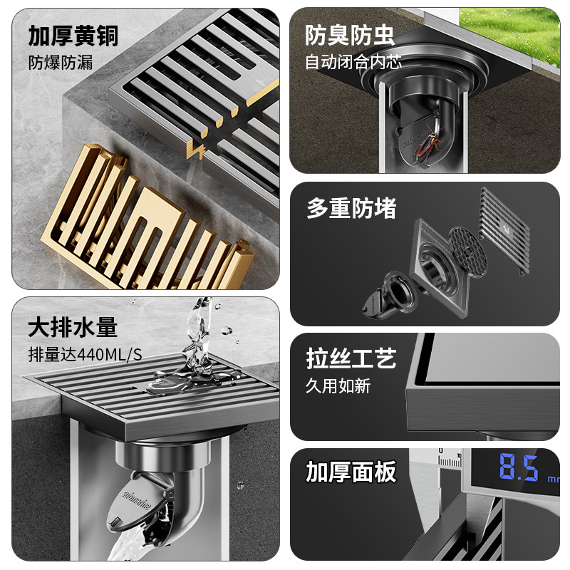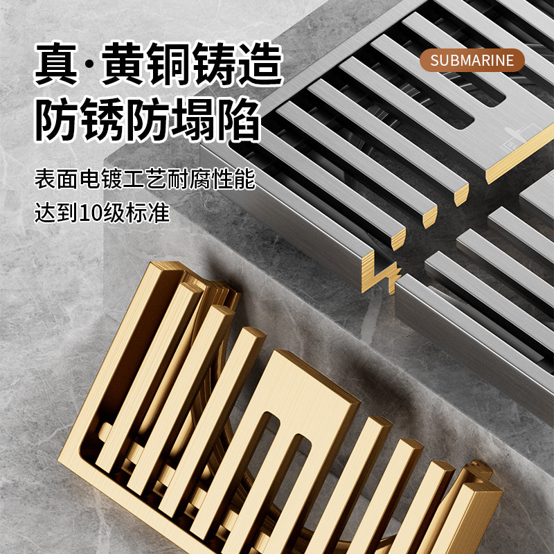 潜水艇地漏防臭防堵防反水全铜卫生间淋浴隐形长条通用官方旗舰店