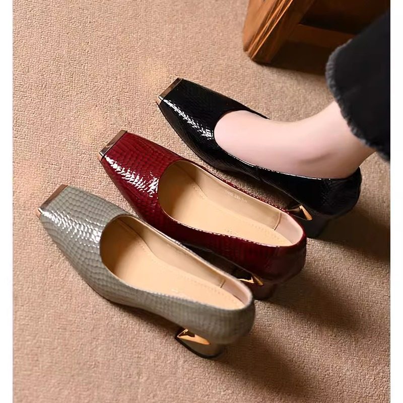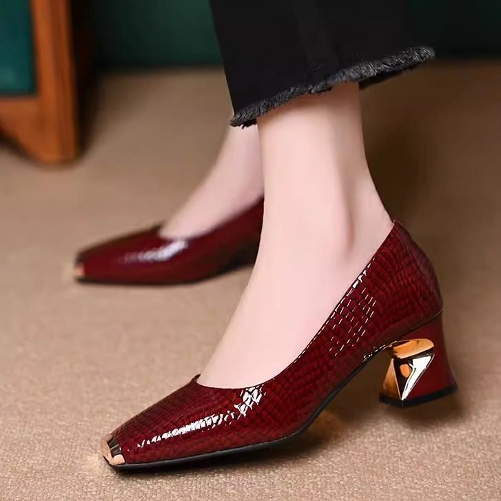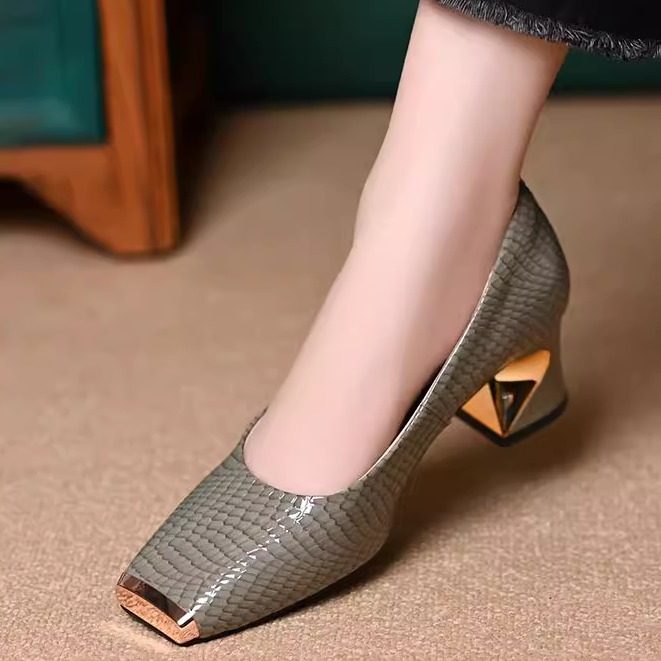 头层牛皮真皮方头女式浅口粗跟单鞋中跟鞋春秋时尚金属头百搭鞋子