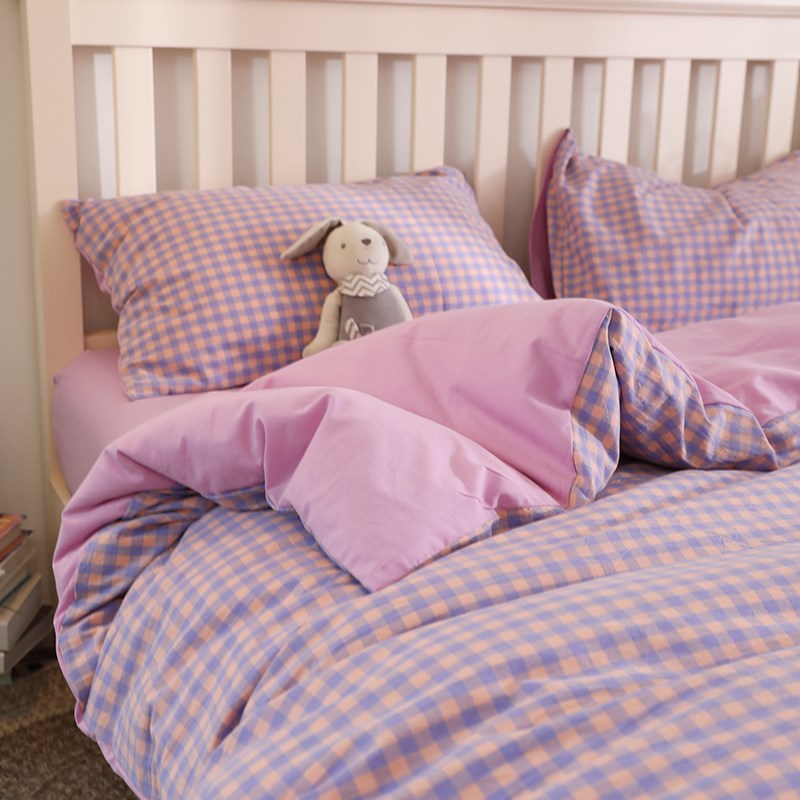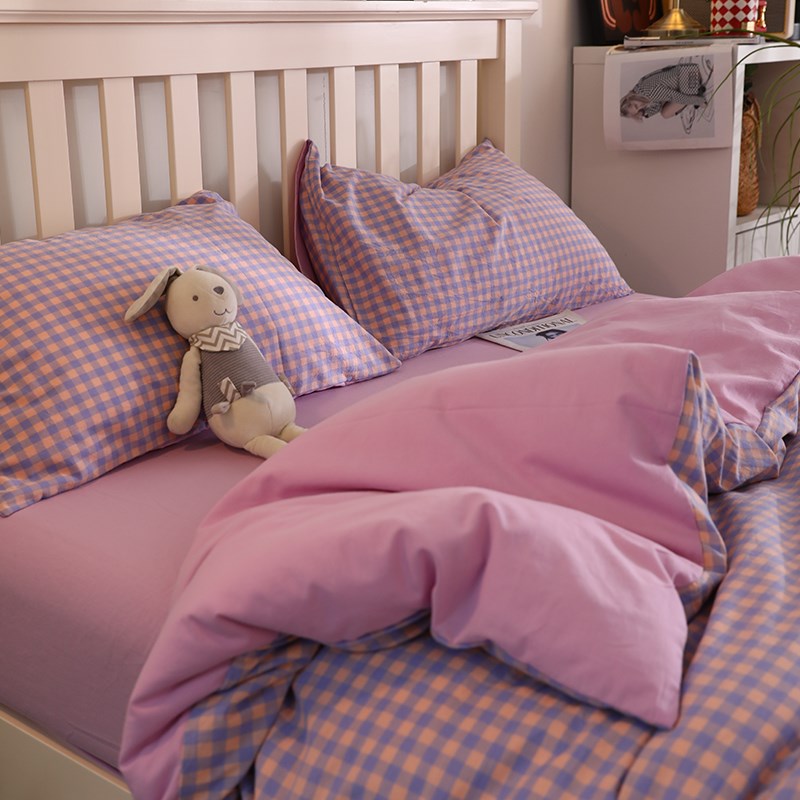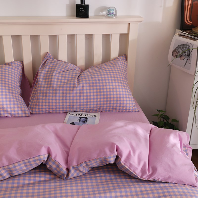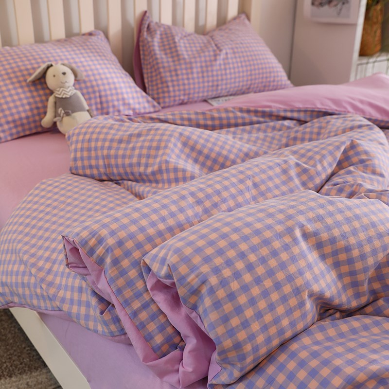 少女水洗棉紫色格子床上四件套1.8米全棉床单被套宿舍1.5m三件套