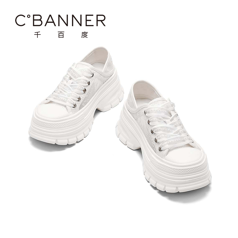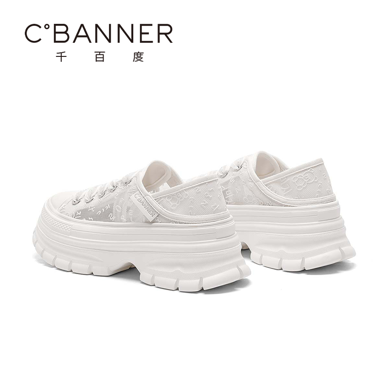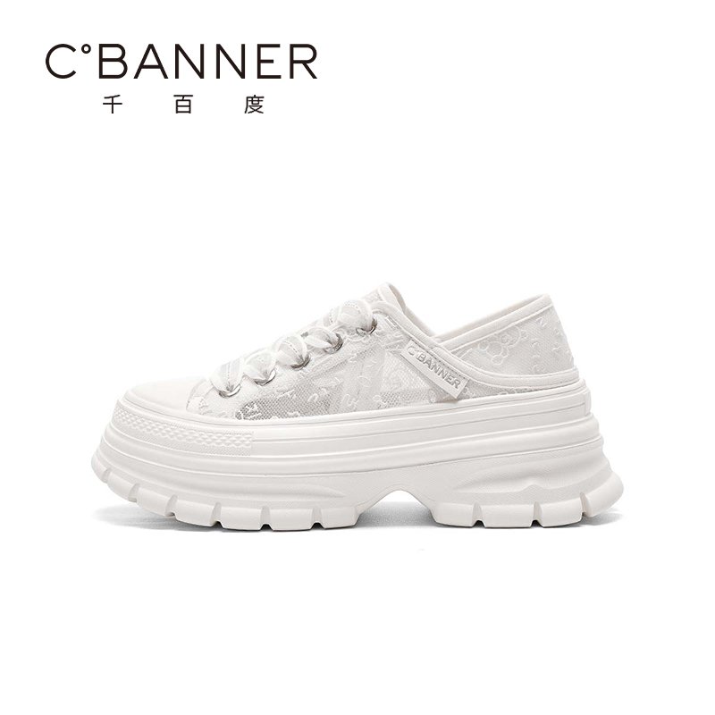 千百度休闲鞋女夏季新款时尚刺绣网面透气松糕小白鞋厚底帆布鞋