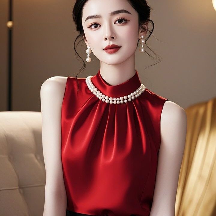 法式小香风白色缎面衬衫女夏季洋气高端欧货时尚独特漂亮无袖上衣