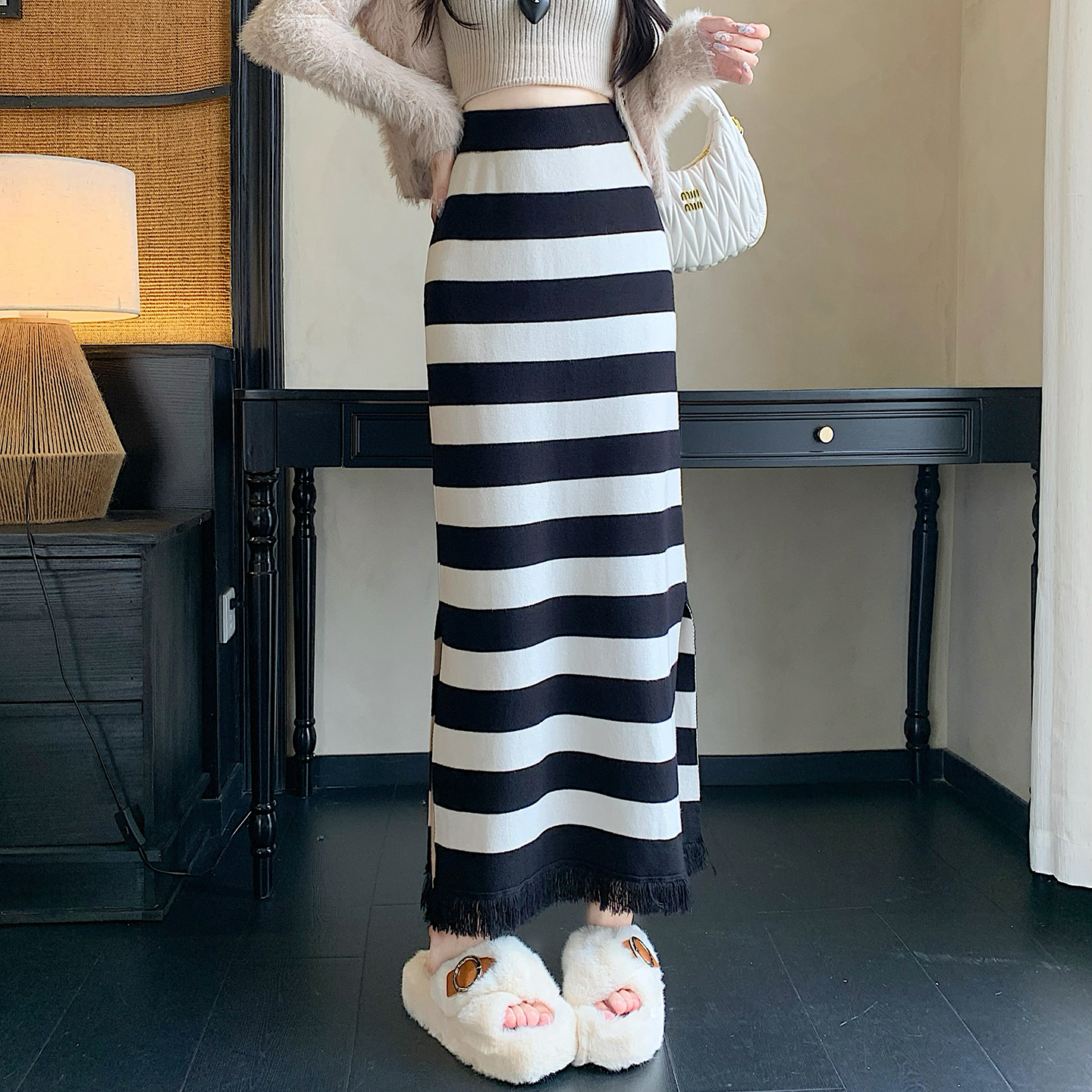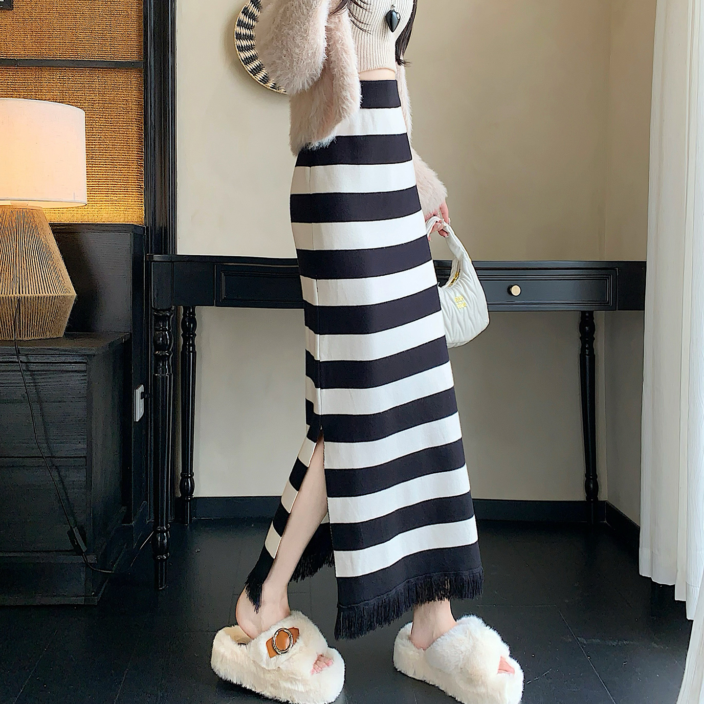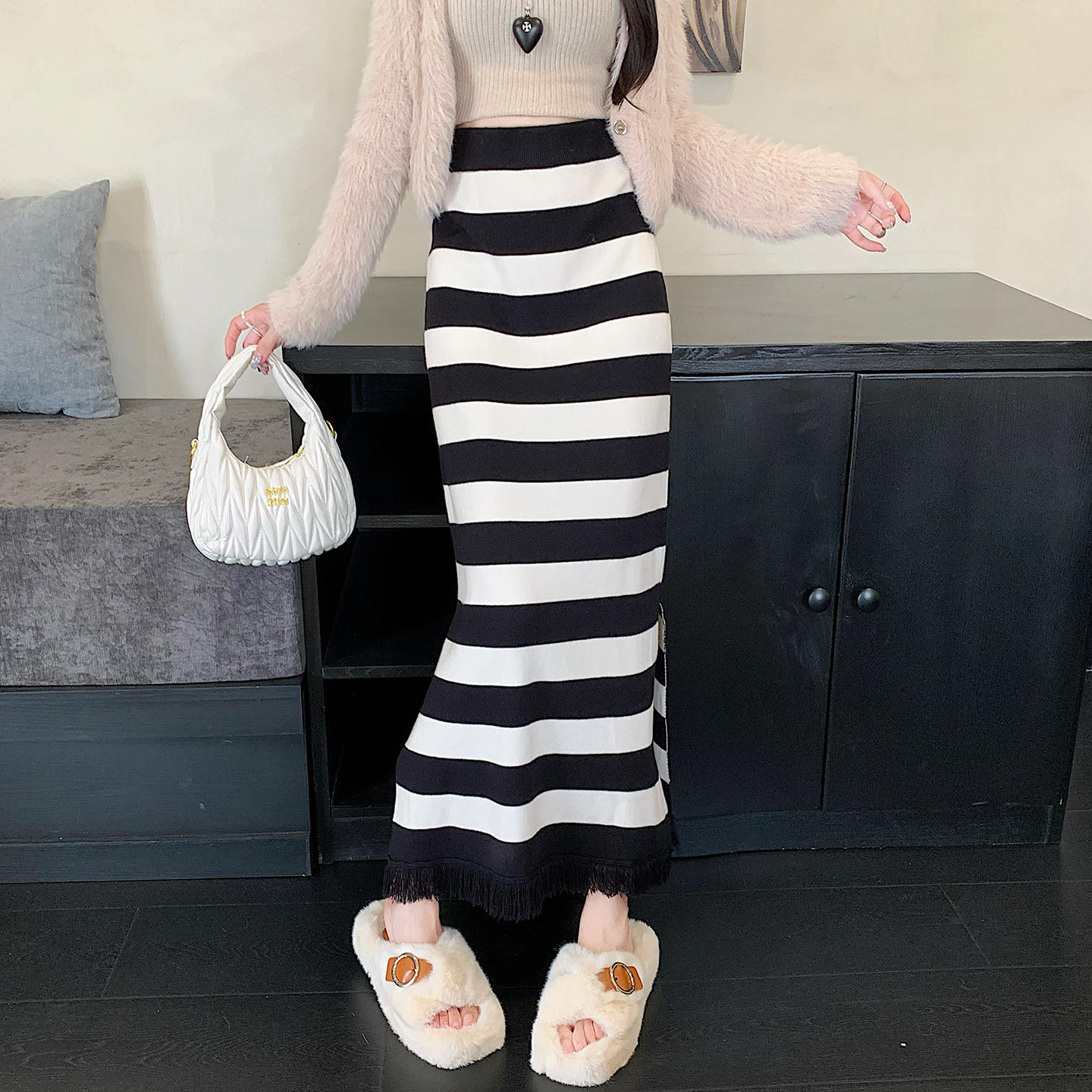 复古条纹流苏针织半身裙子女早秋新款2025气质毛线包臀直筒长裙子
