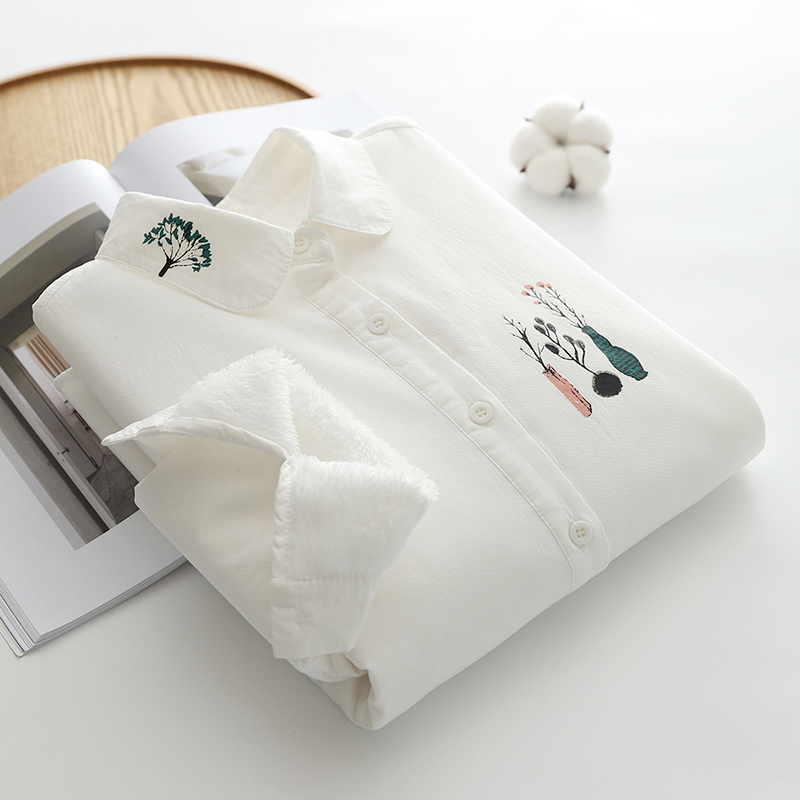 秋冬季纯棉小清新印花加厚加绒衬衫女长袖学生保暖打底内搭白衬